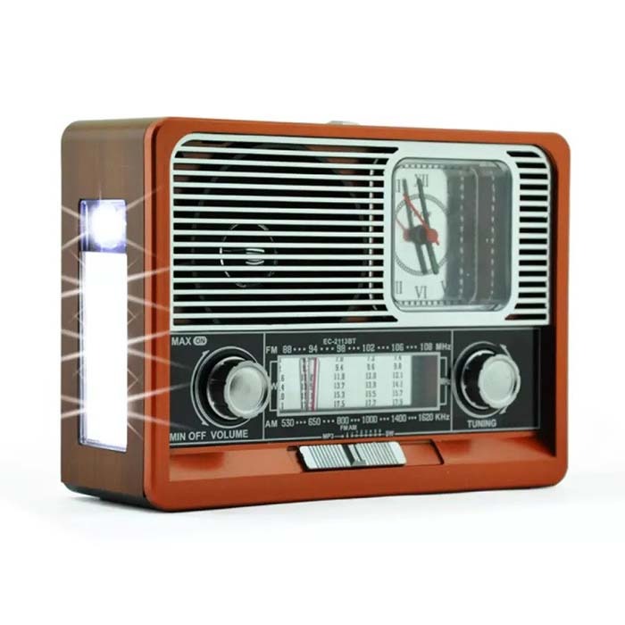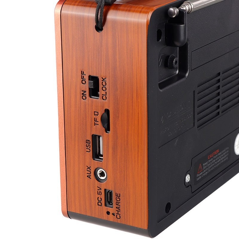 برند اصلی و با کیفیت وزن 550 گرم سایز باند 3 اینچ پشتیبانی از فلش و مموری و AUX و بلوتوث ورژن 5.0 ابعاد 18*7*13 مجهز به ساعت عقربه ای مجهز به چراغ قوه پر نور مجهز به رادیو 8 باند (FM,AM،SW1-6) مجهز به باتری قابل شارژو همچنین قابل تعویض 18650 مجهز به بند آویز و آنتن اکسترنال سرخود صدای بسیار شفاف و بلند و با کیفیت مدت نگهداری شارژ 2 الی 3 ساعت مجهز به سوکت 5 ولت میکرو USB جهت شارژ