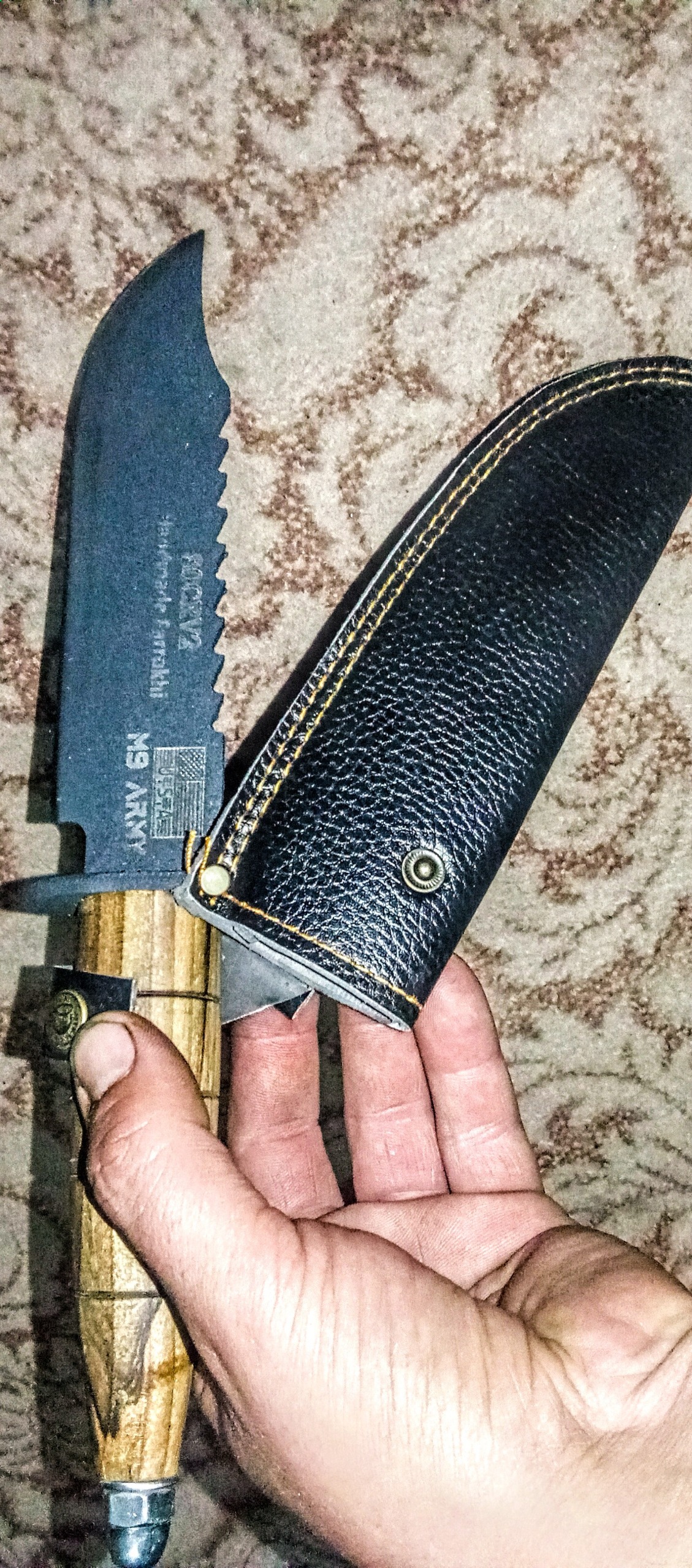 چاقو شکاری استادفرخی طرح آمریکایی دسته چوبی تیغه ضخیم5میل استان فولادخشکه آبدیده تیزوبراتضمینی همراه غلاف چرمی به طول30 سانت