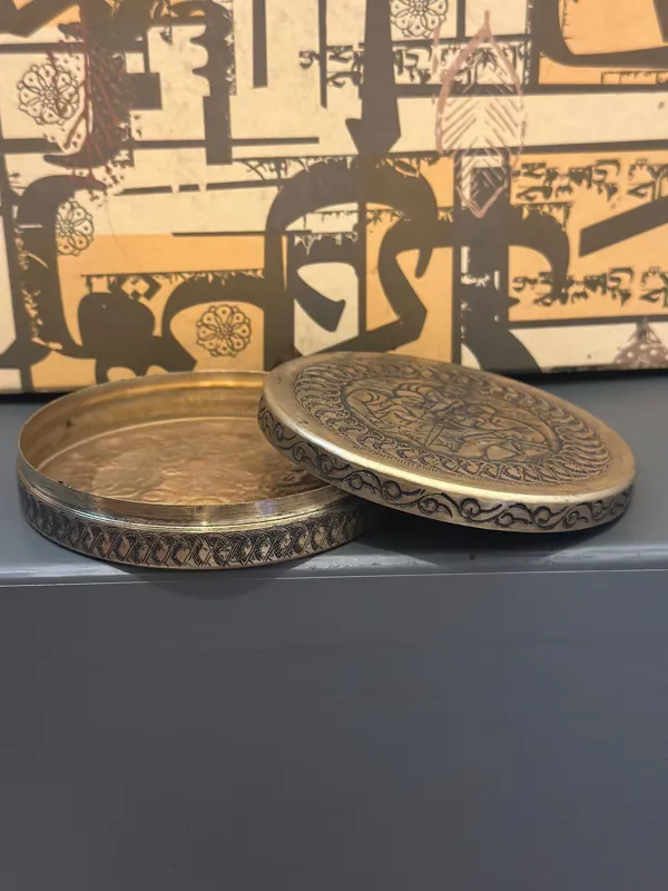جاجواهری یا حبدان یا جعبه برنجی قلم دست استاد کاران معاصر به قطر 10 سانت و ارتفاع 2 سانت به وزن حدود 170 گرم .
