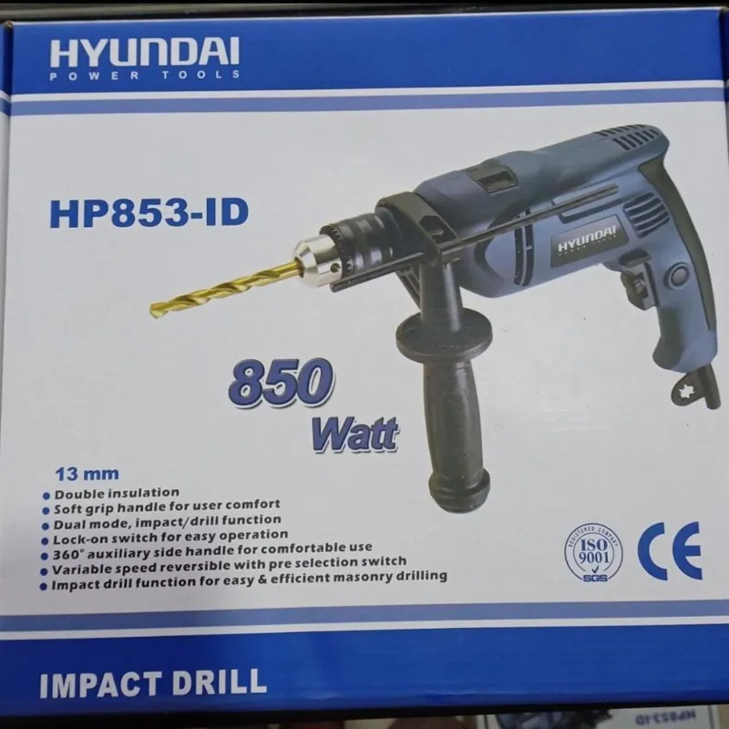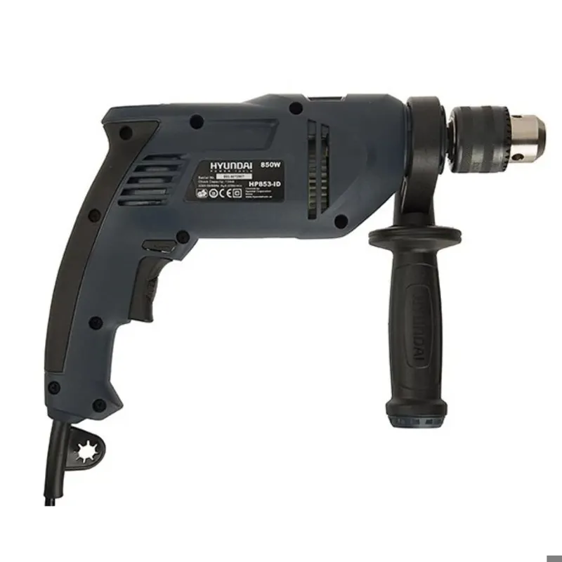 اگر قصد تهیهی یک دریل چکشی مناسب با قدرتی قابل قبول دارید، میتوانید از دستگاه فوق استفاده کنید. این دریل از توانی برابر 850 وات برخوردار است و از قابلیت کنترل سرعت گردش سود میبرد. میزان سرعت گردش این دستگاه توسط کلیدی چرخشی که روی شستی قرار دارد تنظیم میشود. بازهی سرعت چرخش این دستگاه 2700-0 دور بر دقیقه است. از دیگر مزایای این دستگاه میتوان به قابلیت چرخش ساعتگرد و پادساعتگرد آن اشاره کرد. سه نظام این دریل چکشی از نوع 13 میلیمتری آچارخور بوده و حداکثر قطر سوراخکاری آن در چوب، فلز و مصالح به ترتیب برابر 25، 13 و 13 میلیمتر است. با کمک این دستگاه میتوانید با دقت و تسلط بیشتری به کار خود بپردازید که این ویژگی به دلیل وجود دستهی کمکی و قفل سوییچ این دریل حاصل شده است. این دسته قابل تنظیم بوده و از قابلیت چرخش 360 درجه سود میبرد. دستگاه فوق با نام (HP853-ID) شناخته میشود و یکی از تولیدات شرکت «هیوندای» (Hyundai) است.