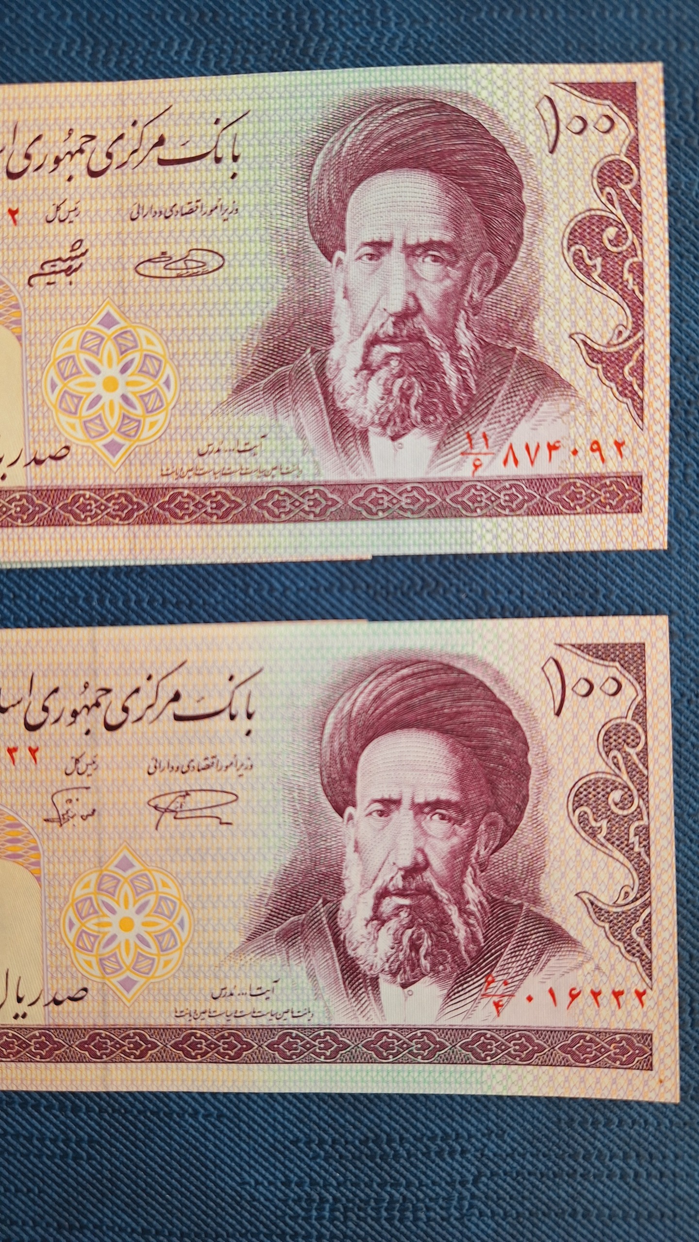 یک جفت امضاء صفدر حسینی، شیبانی(فیلیگران امام) با نخ نستعلیق که مقداری آروز کادر در روی اسکناس نیز مشهود است.