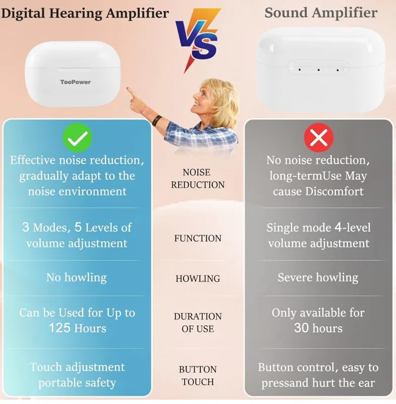 تقویتکننده شنوایی هوشمند و قدرتمند با قابلیت کاهش نویز تقویتکننده شنوایی دیجیتال TooPower با تراشه پیشرفته DSF و میکروفون چند منظوره میتواند صداهای چند جهته را دریافت کرده و 99٪ نویز را کاهش دهد تا به شما کمک کند روی صداها و صداهایی که میخواهید بشنوید تمرکز کنید. این دستگاه با برنامه حالت داخلی و برنامه حالت خارجی برای گزینههای شما ارائه میشود. به شما کمک میکند تا با محیطهای مختلف اطراف بهتر سازگار شوید. ایدهآل برای افراد مسن که به تماشای تلویزیون و شرکت در مکالمات دلپذیر با خانواده کمک میکنند.