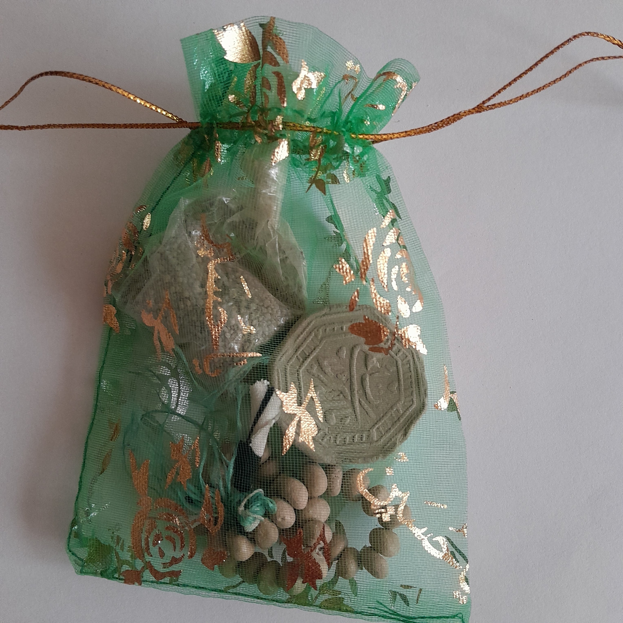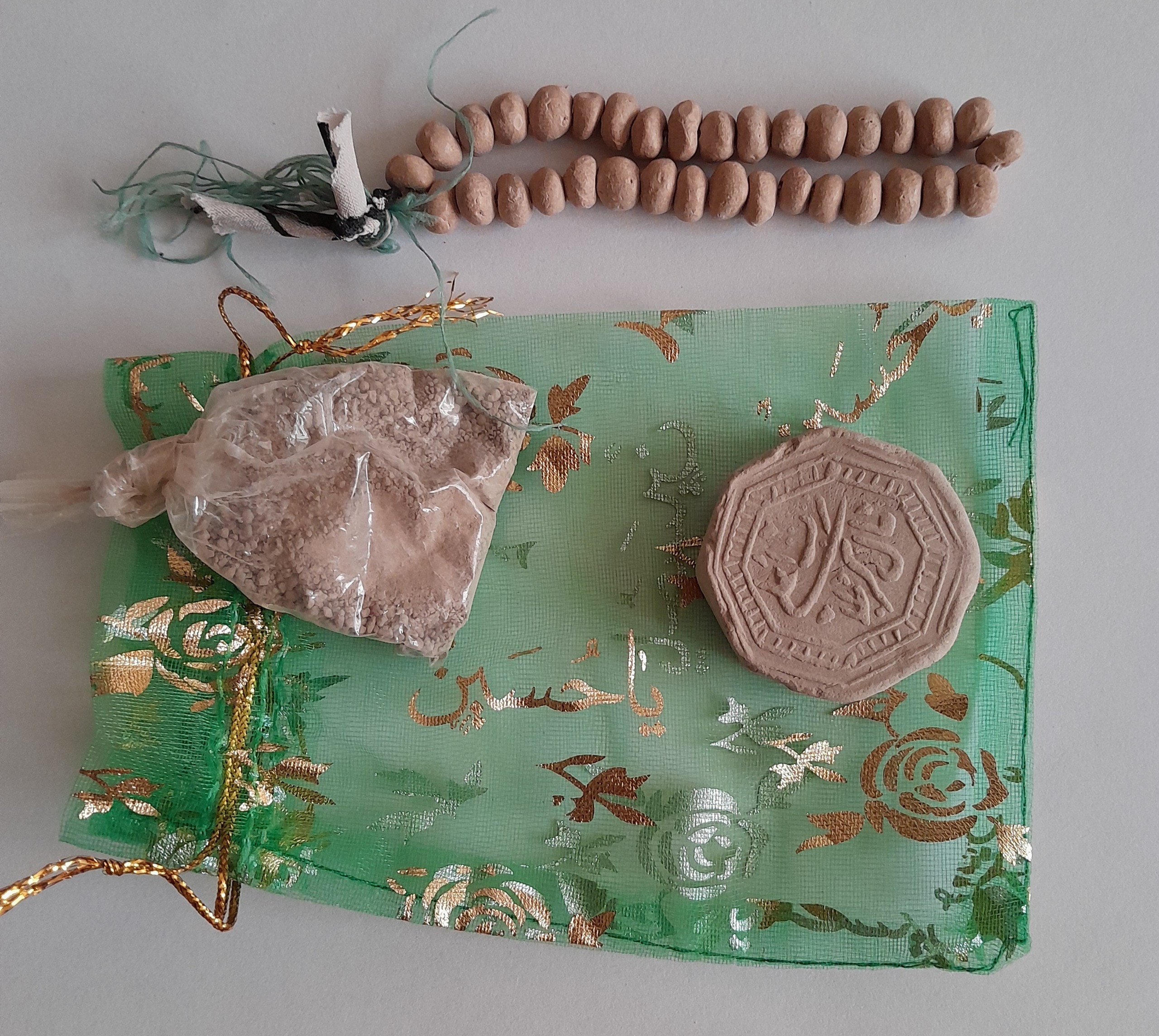 یک مهر نماز و کیسه تربت متبرک در یک بسته