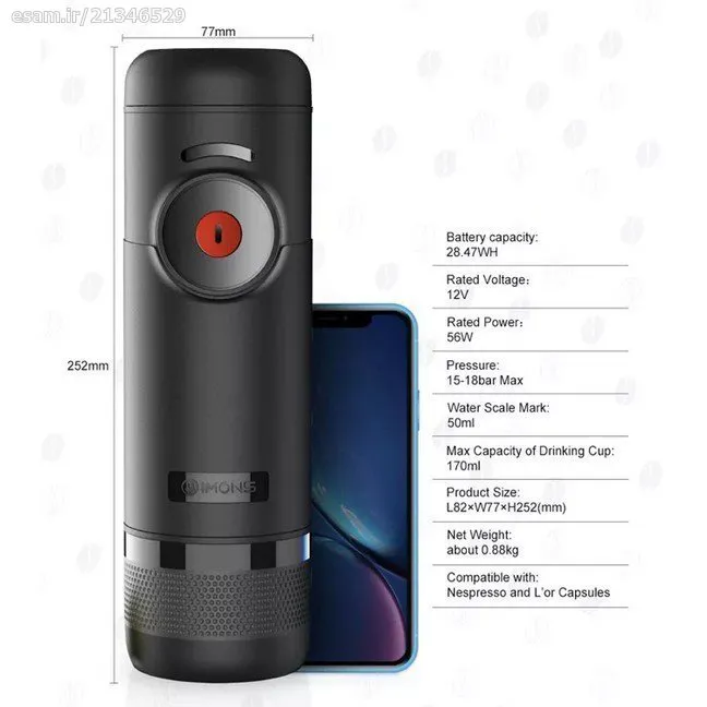 حمل که آب را می جوشاند و با باتری قابل شارژ لیتیوم 3x2600 میلی ساعت کار می کند و با دمای 90 درجه سانتیگراد گرم می شود. به طور خودکار قهوه را در فنجان نوشیدنی چکه می کند. برای طراحی جمع و جور و سبک در فضای باز، آن را در کیف خود قرار دهید می توانید از کابل خودرو