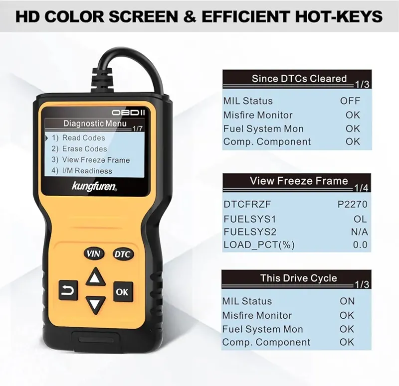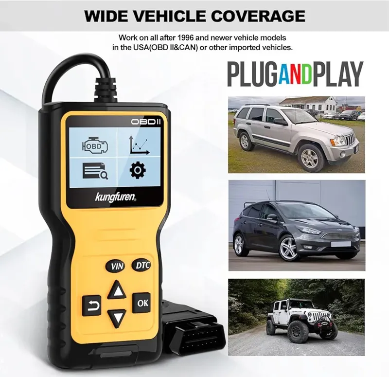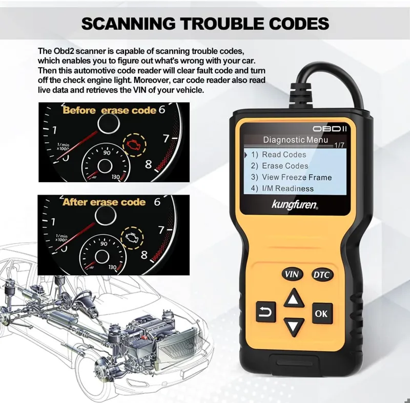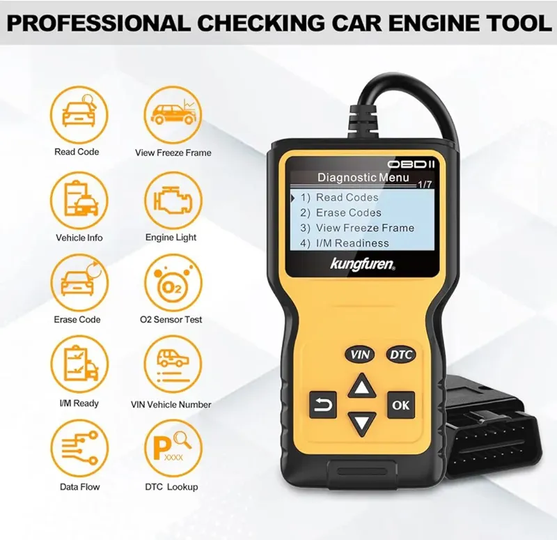 اسکنر OBDII میتواند کدهای خطایی را که ممکن است باعث مشکلات خطای الکترونیکی در وسیله نقلیه شما شوند، در عرض چند ثانیه بخواند و حذف کند، میزان روشنایی موتور (MIL) را تعیین کند (موتور ماشین خود را بررسی کنید) و مانیتور را مجدداً تنظیم کند، یک کتابخانه جستجوی DTC ایجاد کند، میتوانید تعاریف کدهای مرتبط را پیدا کنید که به شما کمک میکند تا تشخیص دهید که آیا ماشین شما نیاز به تعمیر دارد یا خیر، در زمان و هزینه صرفهجویی کنید و عمر/عملکرد ماشین خود را تا حد زیادی بهبود بخشید.