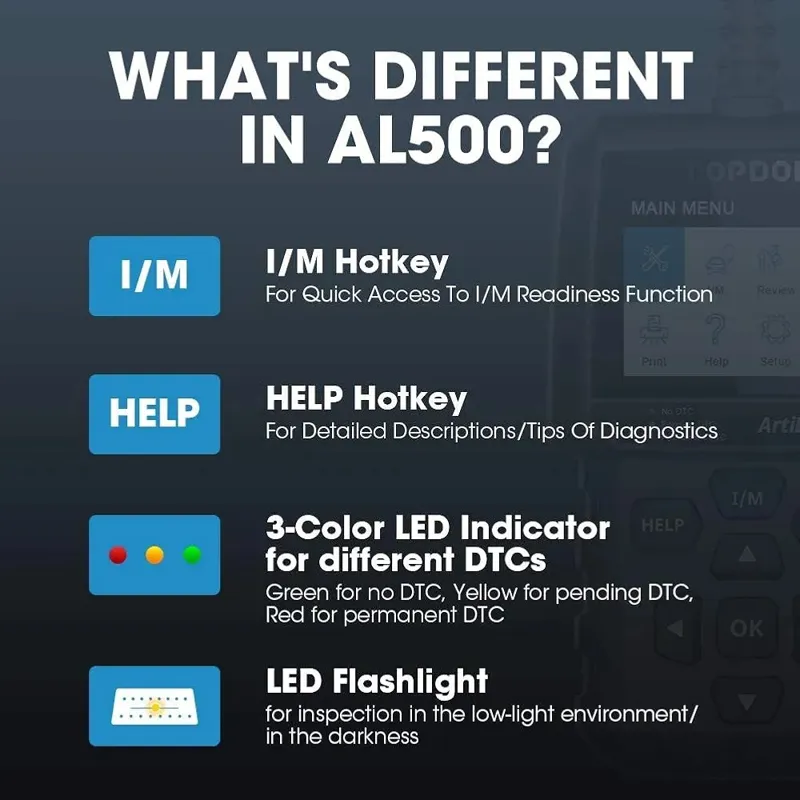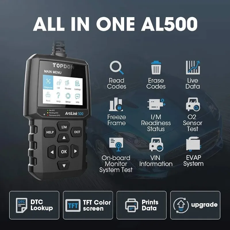 ابزار تشخیصی خودرو TOPDON AL500، کد خوان موتور، عملکردهای کامل OBDII/EOBD، خواندن/پاک کردن کدها، آماده سازی I/M، VIN خودکار، جستجوی DTC، منوهای راهنمای یکپارچه