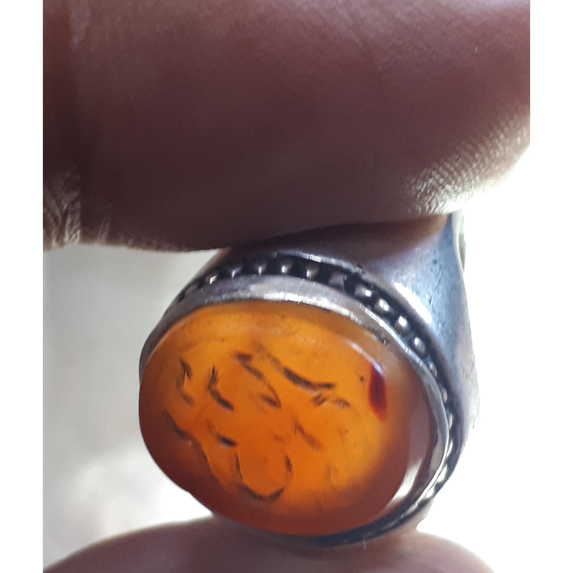انگشترعقیق یمن لکه خونی یمنی خط چپ قاجاری حکاکی با کمانچه بامتن پیرودین محمدقاسم تاریخ 1211 ذات داروکهنسال رکاب فیلی