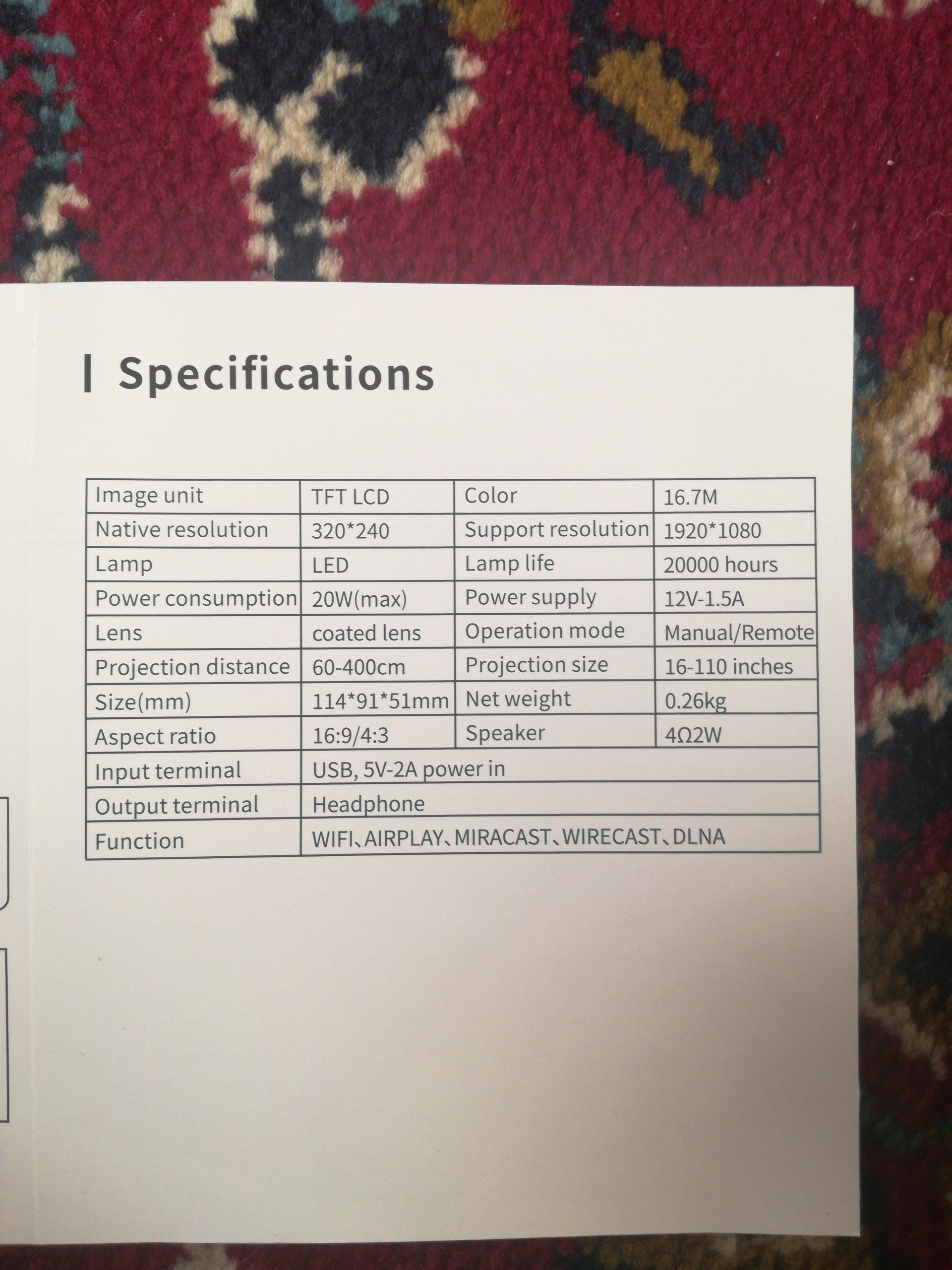 مینی ویدئو پروژکتور سفارش آلمان. 12 ولت 1.5 آمپر . ورودی هدفون و یو اس بی . منبع تغذی برق شهر و پاور بانک و برق 12 ولت. دارای وای فای داخلی و قابلیت اتصال به گوشی موبایل از طریق میراکست و ایرپلی و وایرکست. قابلیت اتصال گوشی با سیم. مشخصات کامل در عکس ها و عکس آخر موجود است. دارای تنظیم لنز دستی جهت با کیفیت شدن تصاویر . با کیفیت هست. برای مسافرت عالی هست.