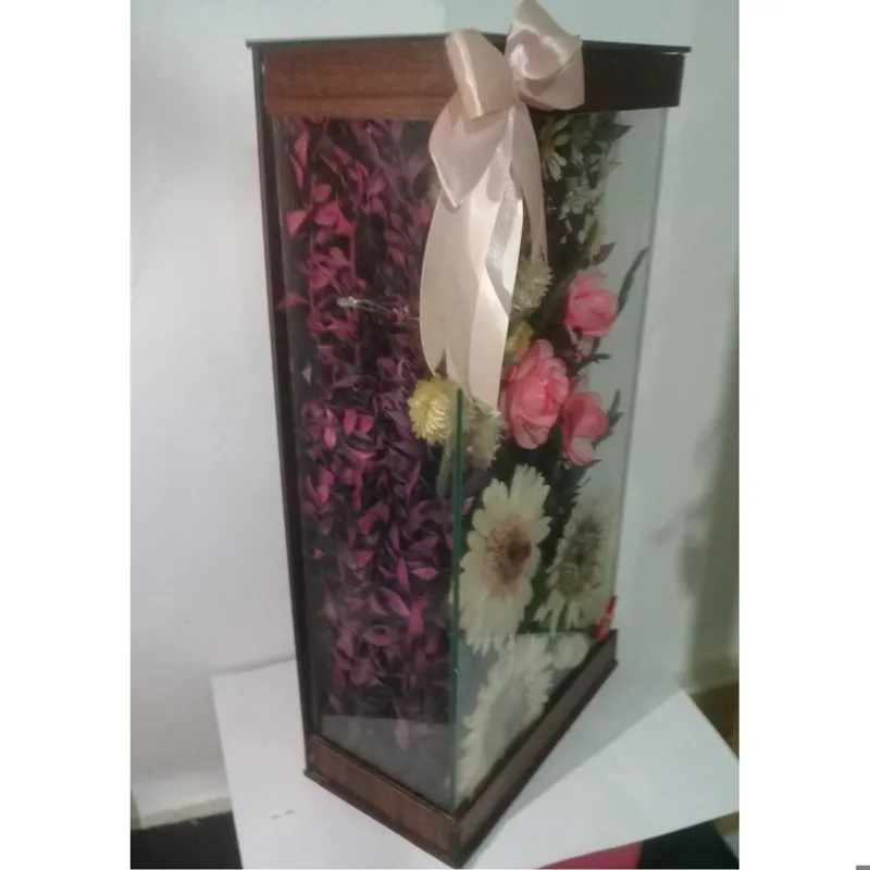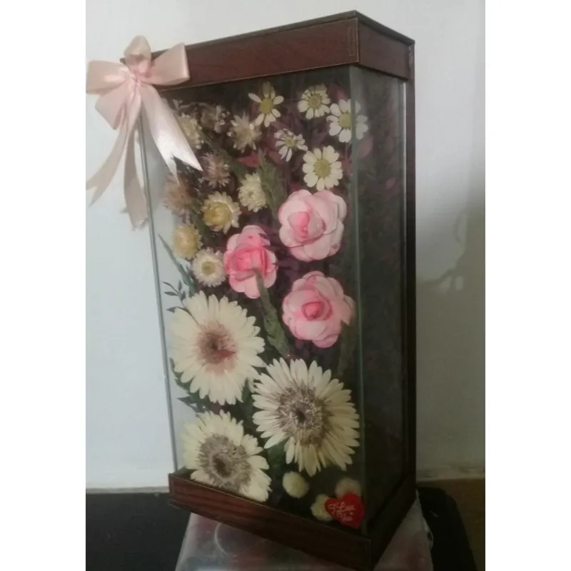 جعبه گل خشک شده داخل محفظه چوبی و شیشه ای با گل و خاشاک خشک شده با دستگاه باماندگاری دائمی بدون به هم ریختگی یا خرابی...وارداتی و درجه یک ...مناسب خواستگاری یا زایشگاه و بیمارستان یا جایی که به بوی گل حساسیت دارند و دکوری از گل های طبیعی همیشه تازه زیبا در منزل