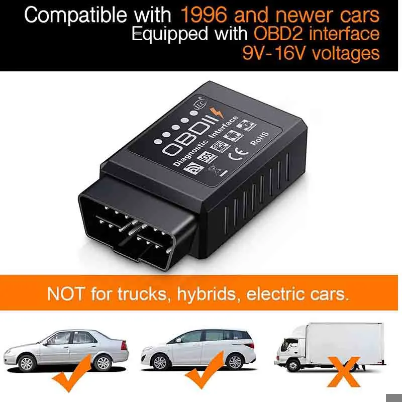 9 ولت تا 16 ولت) کار میکند. از پروتکلهای OBD2 پشتیبانی میکند: SAE JI850 PWM، SAE JI850 VPW، ISO9141-2، ISO14230-4 (KWP2000)، ISO 15765-4 CAN (به جز خودروهای دیزلی، هیبریدی و برقی).