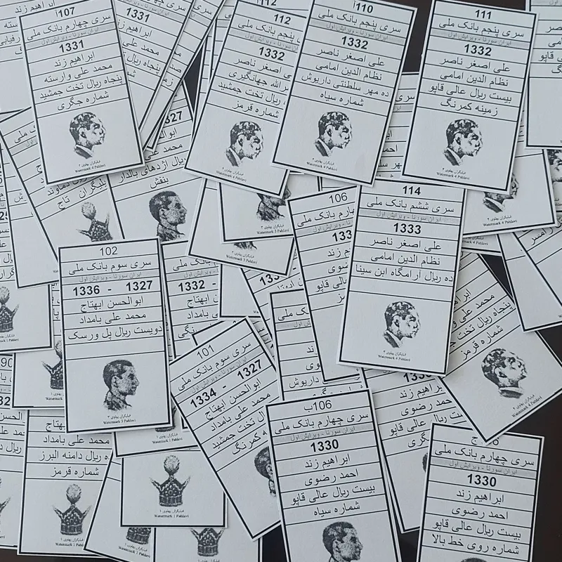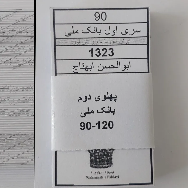 شامل 47  برگ مشخصات اسکناسهای پهلوی دوم بانک ملی از شماره 90 الی 120 و تعدادی شماره های ممیزی