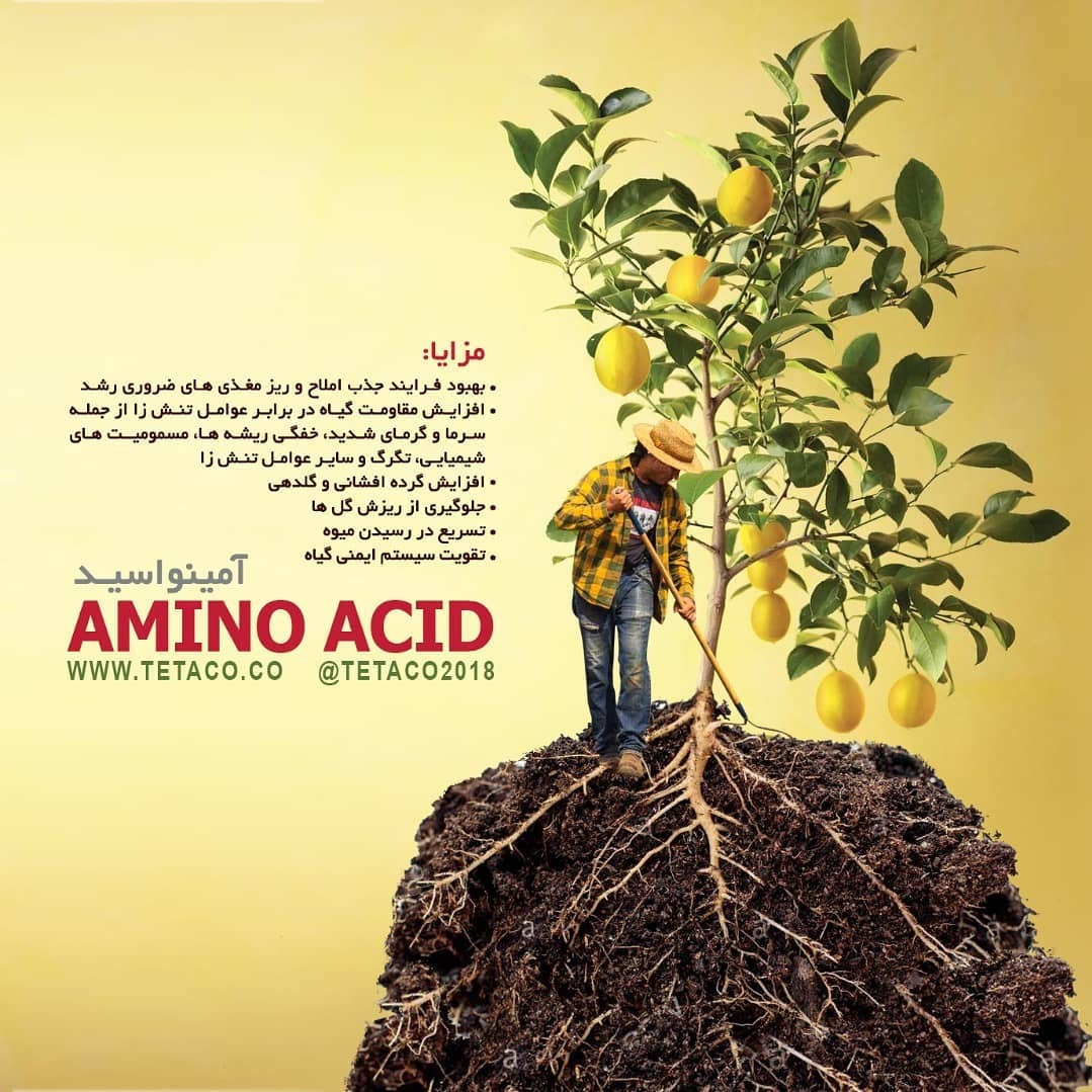 آمینو اسیدها برای افزایش سوخت و ساز گیاهی، متابولیسم سلولی و بالابردن کیفیت محصولات کشاورزی ضروری هستند. آمینو اسید ها از اجزای بنیادی در مراحل اولیه سنتز پروتئین بوده و حدوداً 20 نوع اسید آمینه در ایجاد هر پروتئین در سلول ها درگیرند.آمینو اسید هایی که به صورت کود به گیاه داده می شوند با آمینواسیدهای خود گیاه یکی شده و به سنتز پروتئین های ضروری گیاه کمک می کنند. مزایا:افزایش گرده افشانی و گرده دهی.تسریع در رسیدن میوه، جلوگیری از ریزش گل ها و تقویت سیستم ایمنی گیاه ، بهبود فرآیند جذب املاح و ریزمغذی های ضروری رشد و افزایش مقاومت گیاه در برابر عوامل تنش زا از جمله سرما وگرمای شدید، جلو گیری از خفگی ریشه ها و مسمومیت های شیمیایی، همچنین مقام سازی در برابر تگرگ و سایر عوامل تنش زا .