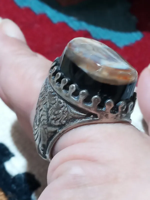 انگشتر نقره بزرگ با رکاب طرح گل خوشساخت ونگین سلیمانی دیدنی وخاص باطوق مشکی