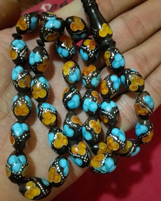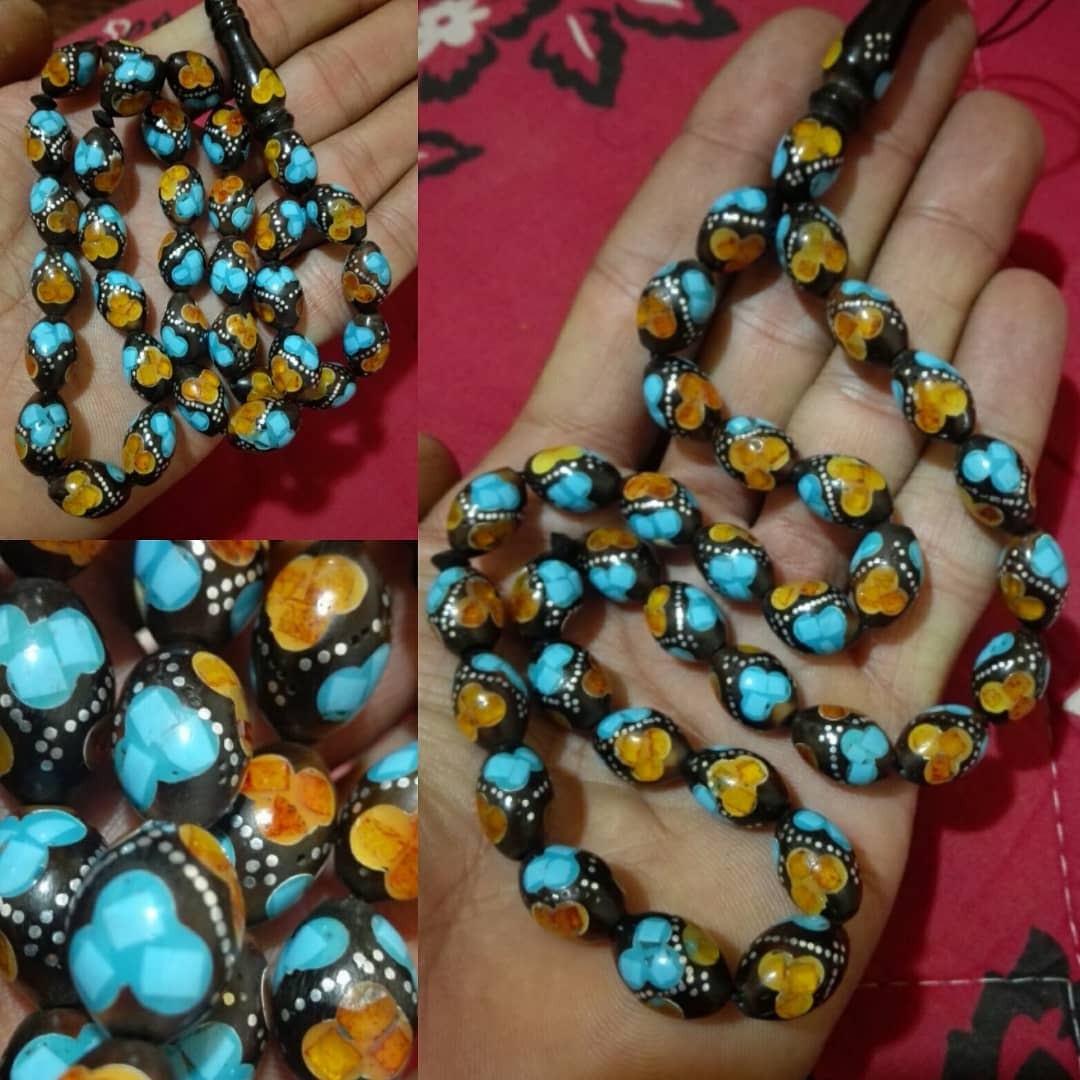 تسبیح فاخر و مجلسی یسر معطر اعلای قدیمی حجازی تراش دست تزئین شده با نقره دوزی، کهرباهای ناب معطر آلمانی و فیروزه های اصیل نیشابوری