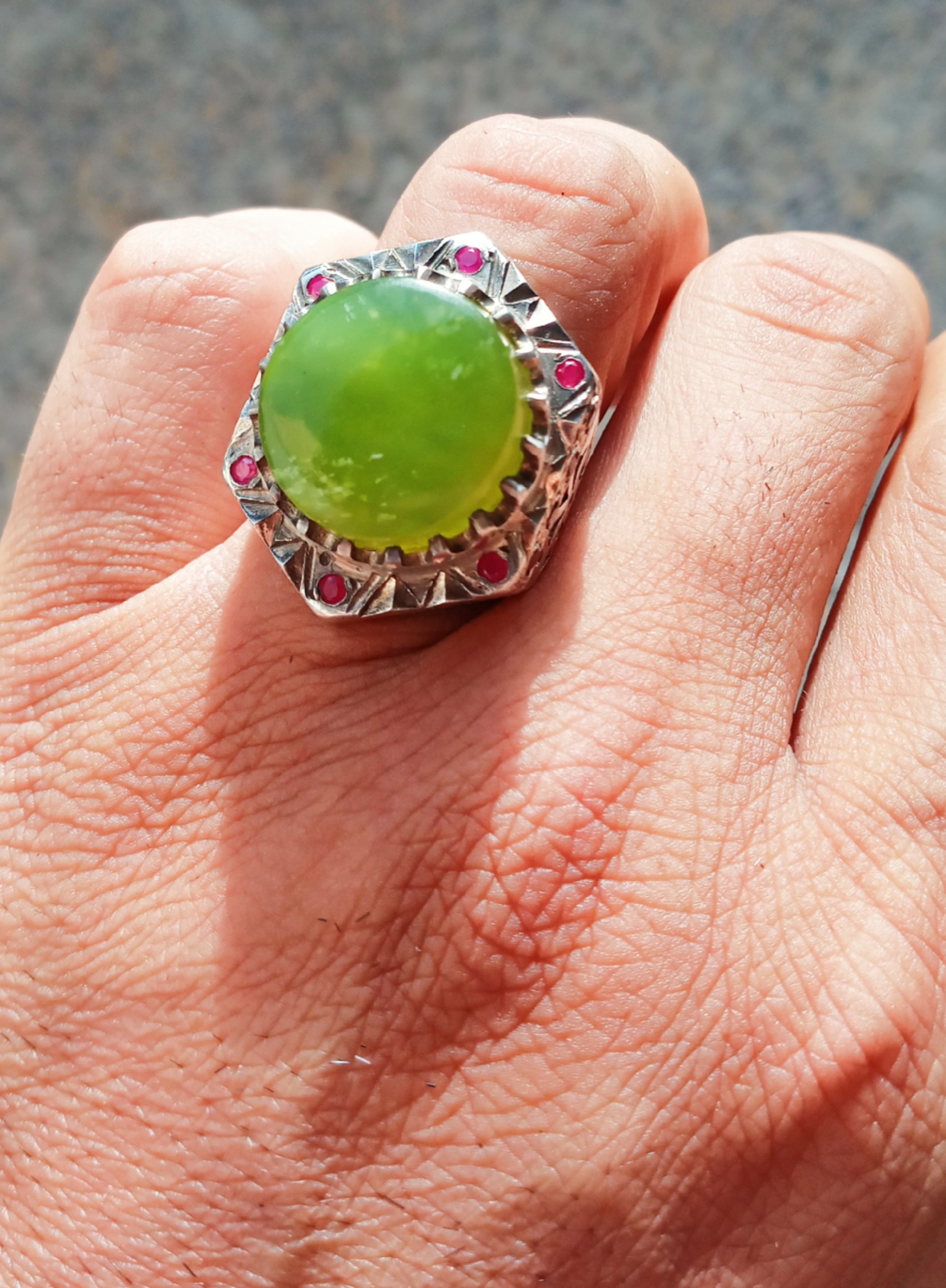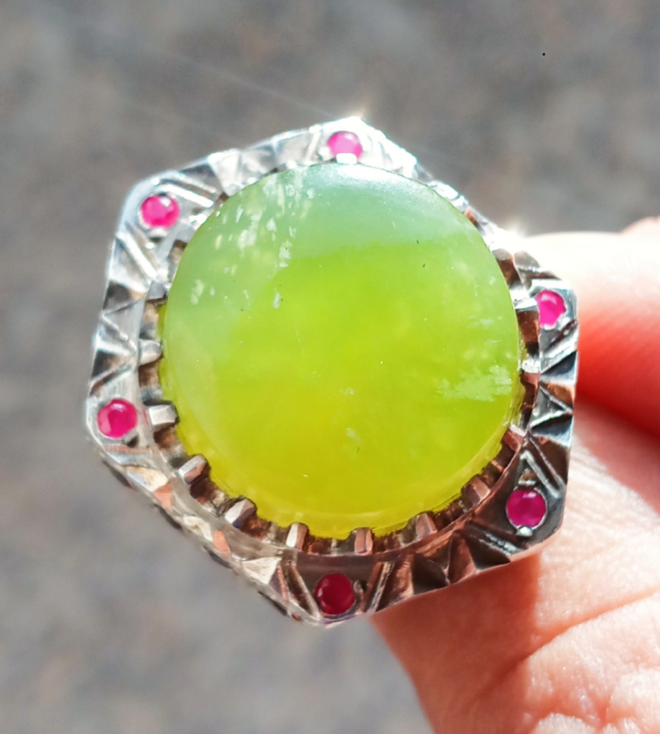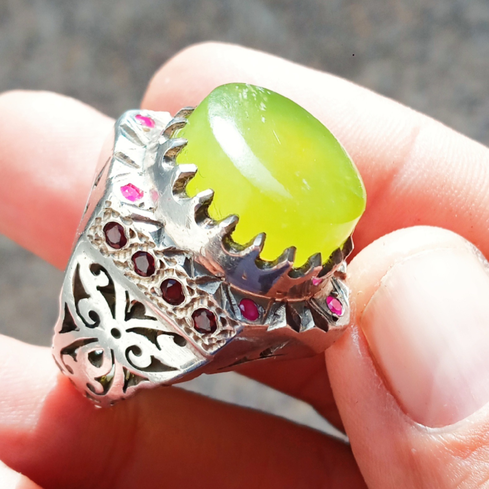 انگشتر زیبا و مجلسی و شیک شاه مقصود اصل افغان سنگ کاملا طبیعی و معدنی خوشرنگ و رکاب تمام دستساز نقره عیار بالا با مخراج گارنت سیلان اصل و یاقوت افریقا