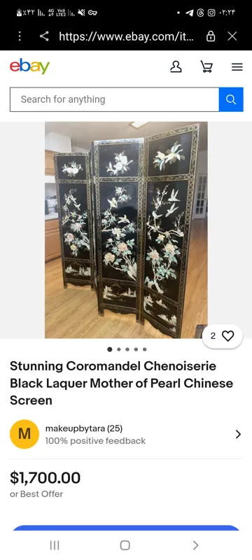 کار قدیمی و آنتیک واقعی همه کار صدف کاری برجسته چهار لنگه کاملا سالم پشت کار هم نقاشی هست عکس آخر قیمت در سایت های خارجی هست که تا200میلیون قیمت دادن و با هزینه وارد کردن خودتون حساب کنید اگر سال برسه قیمت قیمت میخوره حتما از سایت های خارجی استعلام کنید قیمتش رو