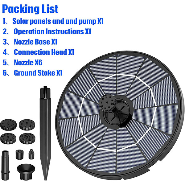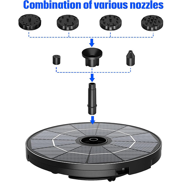(شش مدل آب): فواره خورشیدی شامل 6 نازل است. شما میتوانید طبق سناریوهای مختلف از نازلهای مختلف استفاده کنید که از پاشیدن یا خالی شدن آب از ظرف جلوگیری میکند. نازلها به راحتی مونتاژ میشوند، به دستورالعملهای مونتاژ مراجعه کنید.