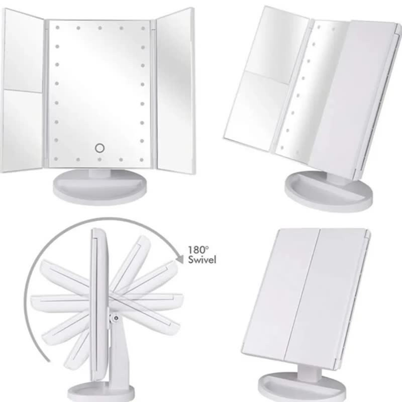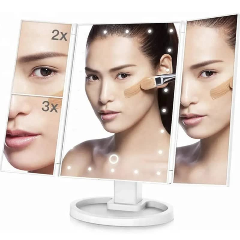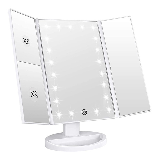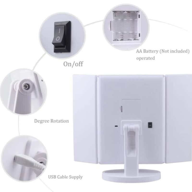 آینه آرایشی سه تاشو LED، آینه آرایشی سه تاشو چراغدار با دکمه T شکل و دیمر، باتری و منبع تغذیه USB
