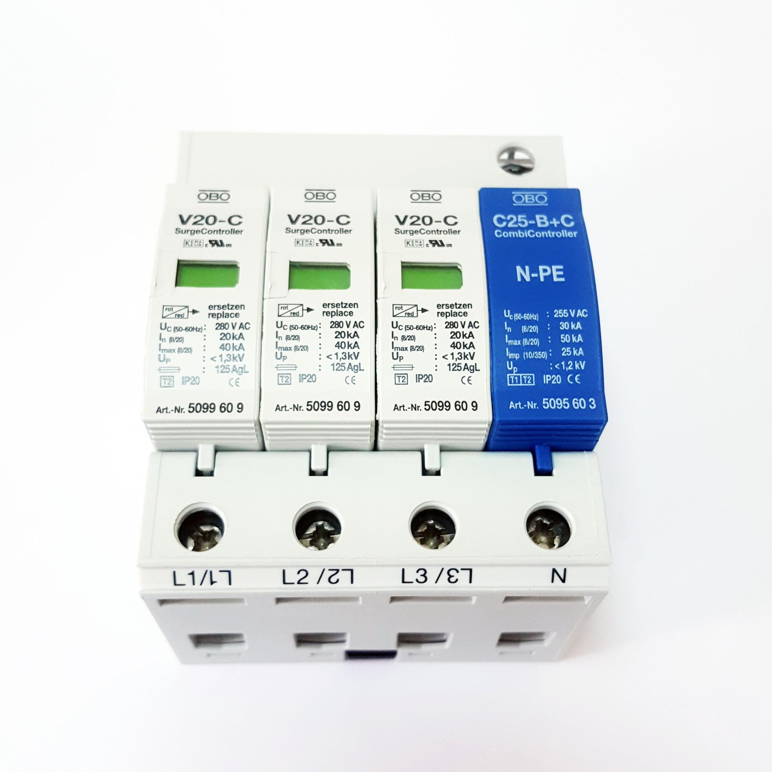 سرج ارستر OBO 5095333 تایپ C چهار پل، سری 20 کیلوآمپر، این ارستر دارای کانتکت ارسال خطا بوده و مناسب جهت نصب در تابلو های فرعی می باشد و در ساختمان هایی که مجهز به سیستم هوشمند می باشند و یا نیاز است که خروجی ارستر به سیستم آلارم متصل گردد، استفاده می شود. فیوز پشتیبان مورد نیاز ارستر، فیوز کاردی با رنج جریان کمتر از 160 آمپر بوده و چنانچه فیوز اصلی تابلو کمتر از این مقدار باشد نیازی به استفاده از فیوز پشتیبان نمی باشد.