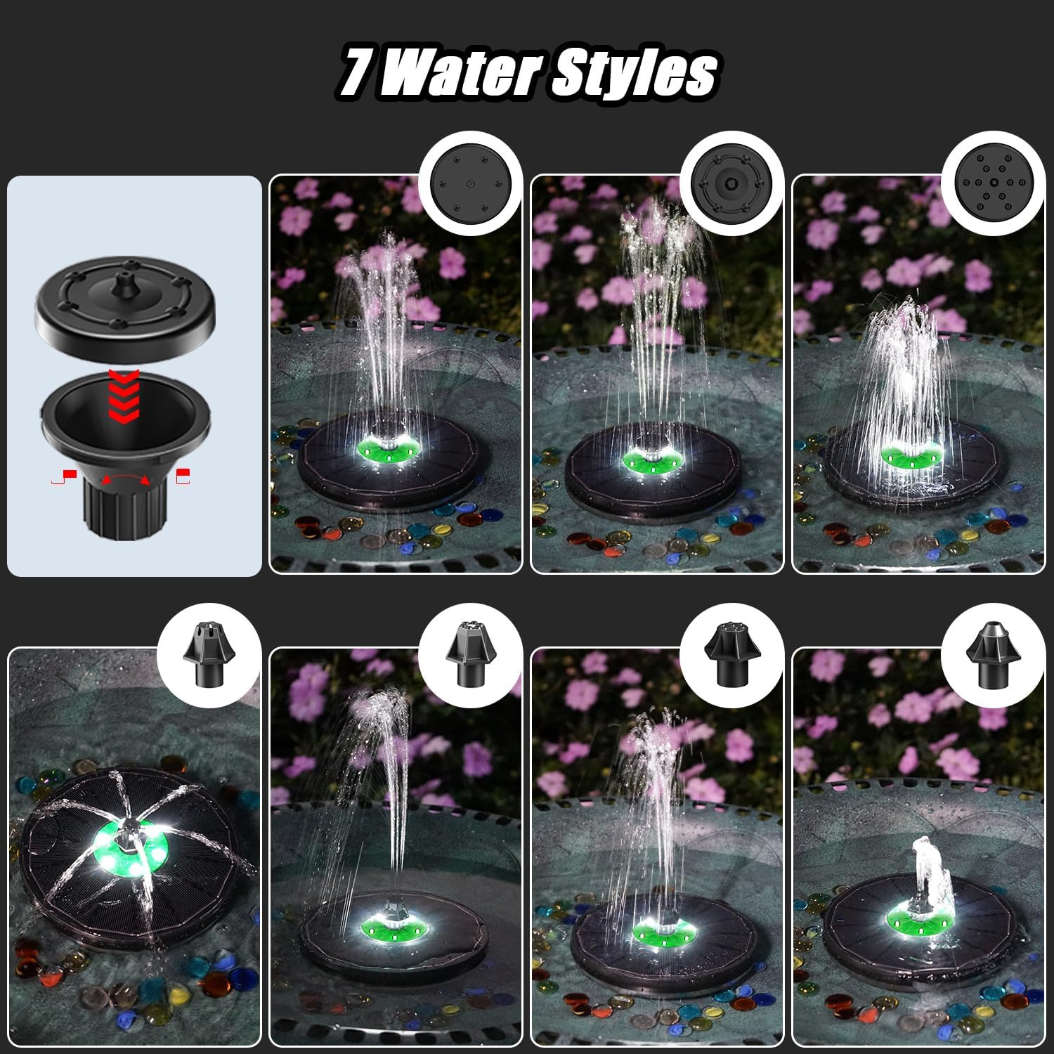 طور موثر از حرکت تصادفی فواره خورشیدی جلوگیری میکنند. با 7 نازل برای انتخاب، شما و خانوادهتان میتوانید از 8 سبک مختلف فواره لذت ببرید. فوارههای حمام پرندگان خورشیدی برای استفاده در برکهها، استخرها، گلدانهای گل، فضاهای باز، پاسیوها و باغها، برای بازی
