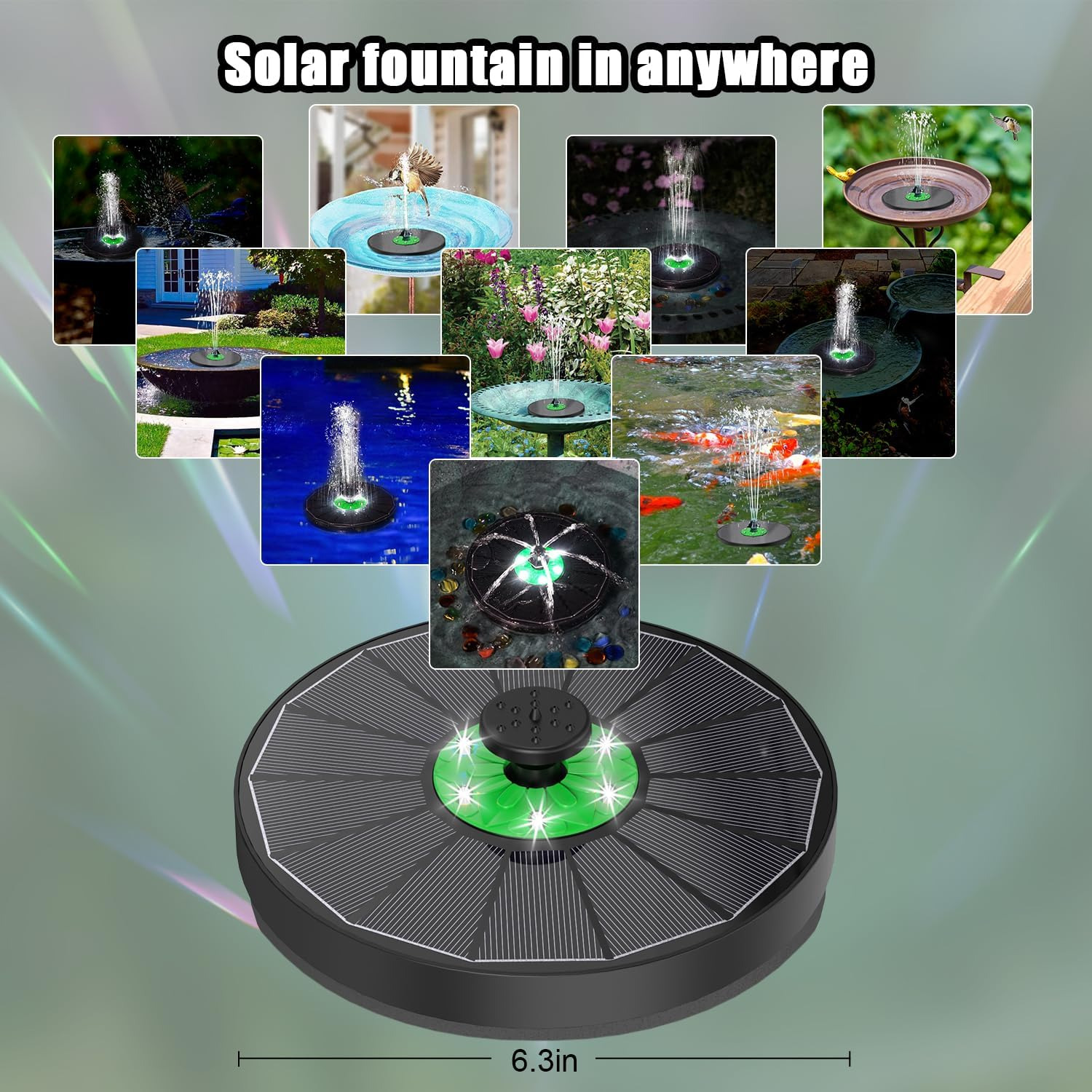 (فواره خورشیدی با گلهای سبز و چراغهای LED سفید): با استفاده از آبنمای حمام پرندگان خورشیدی 3.5 واتی ما که شامل 6 چراغ LED است، فضای باغ خود را زیباتر کنید. با فرا رسیدن شب، فواره با نمایش چراغهای LED که به طور خودکار روشن میشوند،