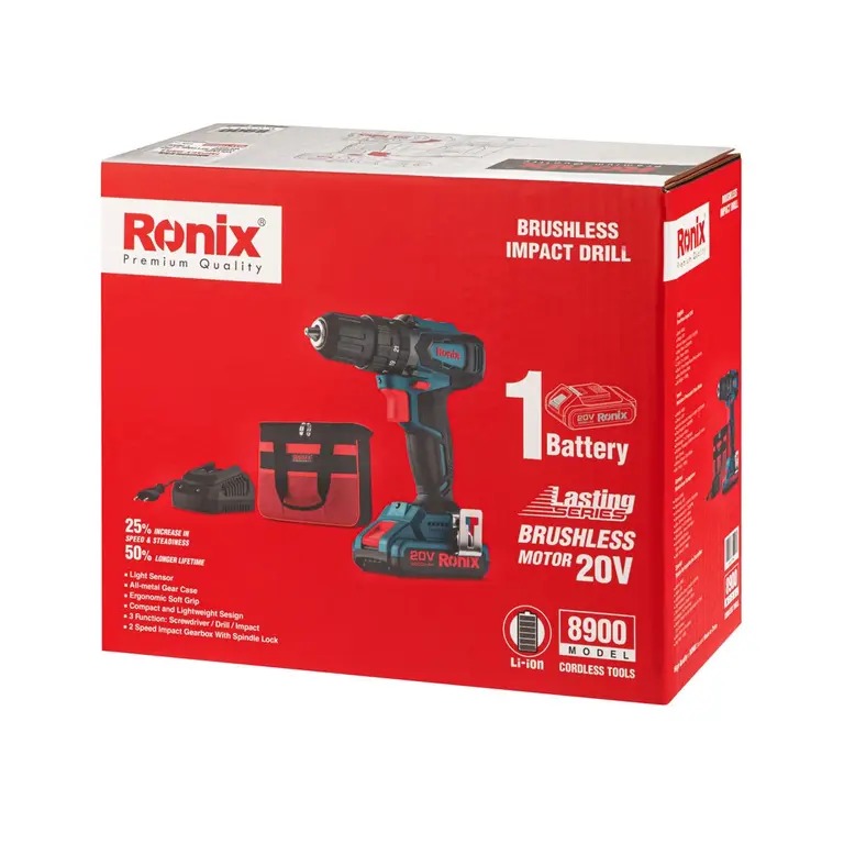 موتور براش لس و مقاوم به رطوبت و غبار در دریل پیچ گوشتی 8900 رونیکس، انرژی مورد نیاز خود را از یک عدد باتری لیتیوم یون 20 ولت با طول عمر و دوام بالا تامین می کند. این موتور، 50% طول عمر بیشتر و 25% سرعت و یکنواختی عملکرد بیشتری را از خود نشان می دهد.