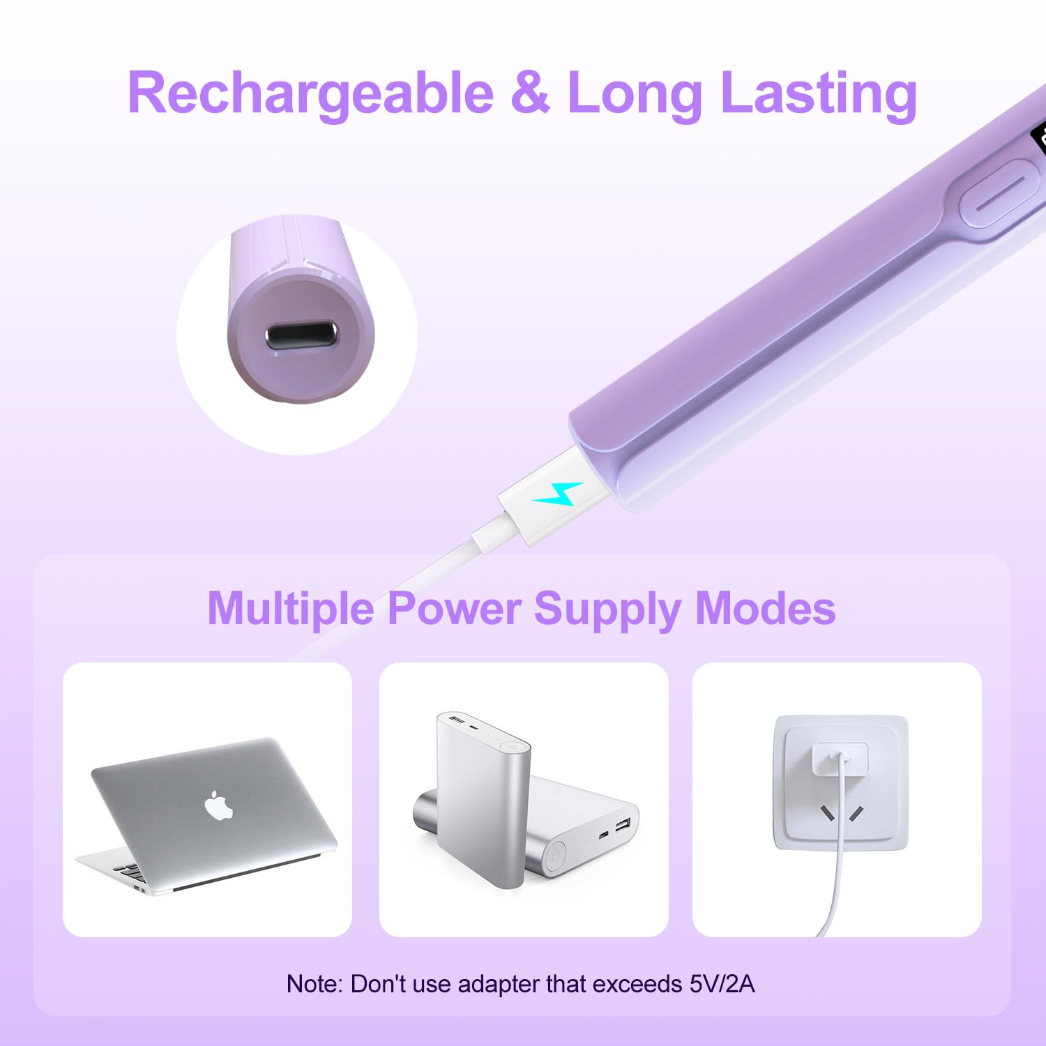 (صفحه نمایش LED و قابل شارژ): این لامپ ناخن UV دارای یک صفحه نمایش LED است که زمان دقیق باتری و خشک شدن را نشان میدهد. با ظرفیت 400 میلیآمپر ساعت، با هر بار شارژ 90 تا 120 دقیقه کار میکند و از طریق هر پورت USB شارژ میشود (توجه: از آداپتوری استفاده کنید