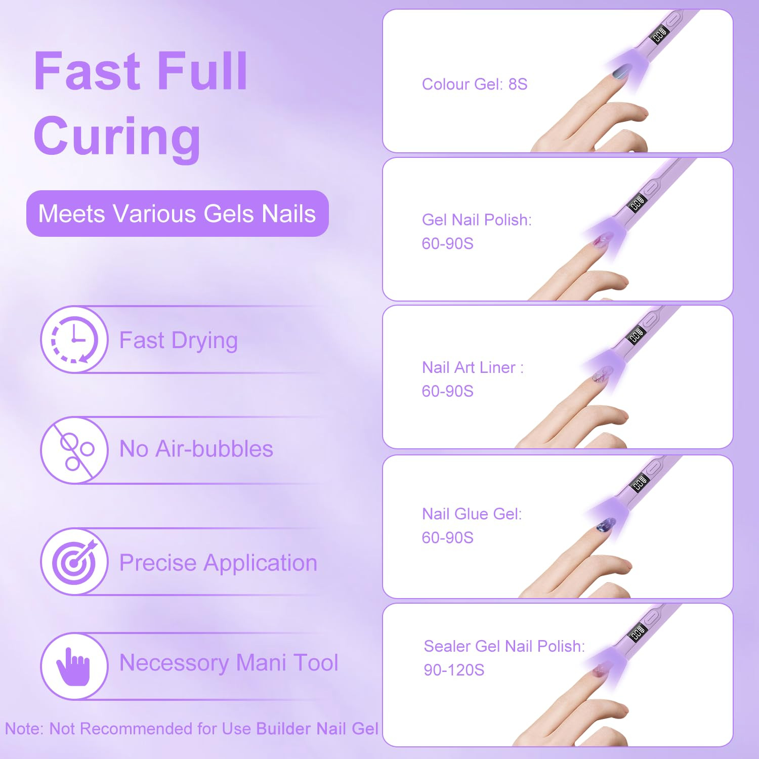 (کوچک اما قدرتمند): لامپ ناخن مینی ما جمع و جور و قابل حمل است. دو تنظیم زمان ارائه میدهد: فشار کوتاه به مدت 20 ثانیه، فشار طولانی به مدت 60 ثانیه، که به شما امکان میدهد طرحهای مختلف ناخن را برای زمان خشک شدن انتخاب کنید. این لامپ UV تمام ژلهای ناخن مانند