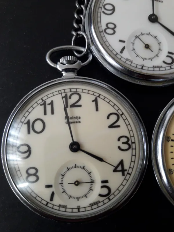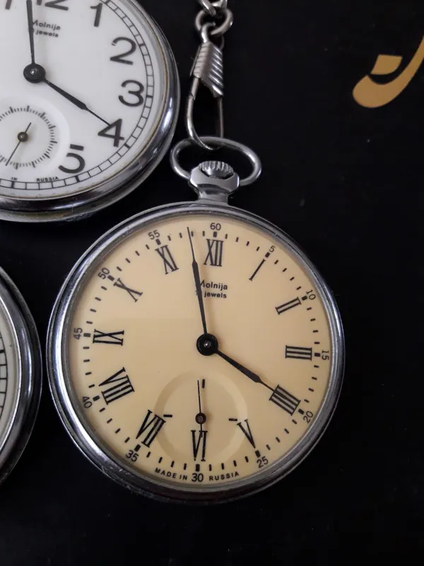 3 عدد ساعت روسی کوکی جیبی مولینجا در حد نو با کار کرد دقیق بفروش میرسند قیمت برا هر 3 تاست تکی فروش ندارم و همچنین مرجوعی هم ندارم