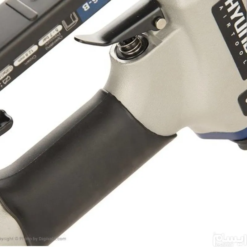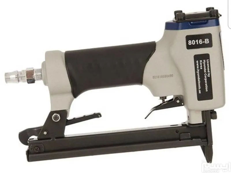 محصول فوق یکی از انواع دستگاههای منگنه کوب بازار است که انرژی مورد نیاز خود را از نیروی باد تامین میکند. این منگنه کوب بادی مدل «8016B» نام دارد و شرکت «هیوندای» (Hyundai) آن را تولید میکند. برای کار با این دستگاه نیاز به کمپرسور دارید. نازل انتهایی دستگاه به خروجی کمپرسور وصل میشود و با کمک فشار باد، سوزن منگنه را به سطح مورد نظر پرتاب میکند. فشار باد خروجی از کمپرسور برای این دستگاه بهتر است در بازهی 100-70 پی اس آی قرار گیرد و از میزان 120 پی اس آی تجاوز نکند. خشاب این دستگاه 125 عددی است و برای کار با آن میتوانید از سوزنهای منگنهای با ارتفاع پایهی 16-8 میلیمتر استفاده کنید. ضخامت پایه و تاج سوزن منگنه قابل استفاده در این دستگاه نیز باید به ترتیب مقادیری برابر 0.7 × 0.91 میلیمتر و 13 میلیتر داشته باشند. این محصول از دستهای با روکشی نرم برخوردار است که مانع از خستگی دست کاربر در هنگام کار میشود.