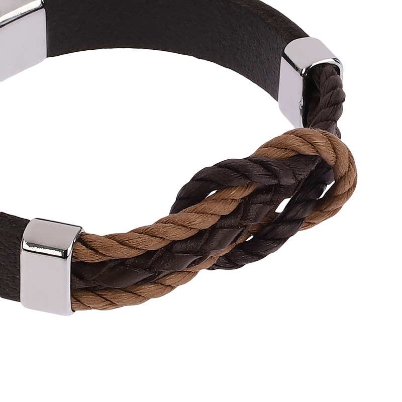 این دستبند با استفاده از چرم بافت قهوهای و مشکی و قفل فلزی لنگری،
