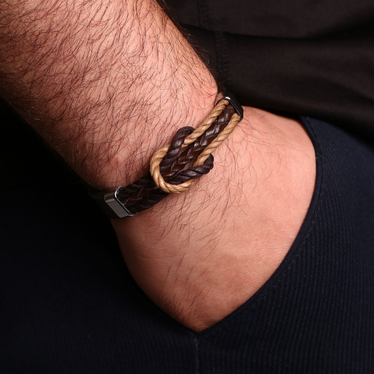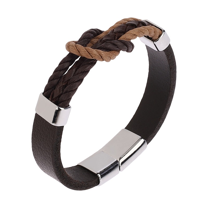 دستبند چرمی مردانه مدل گره دوبل با طراحی خاص، چرم بافتی و قفل لنگری فلزی،