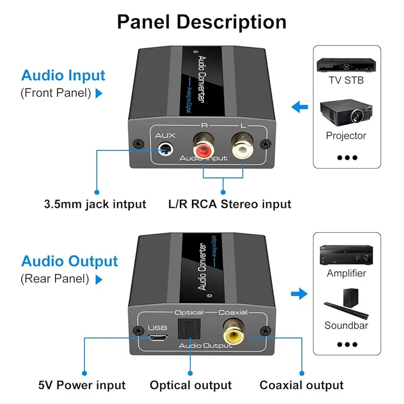 [مبدل صدای آنالوگ به دیجیتال] سیگنال صدای آنالوگ RCA یا استریوی 3.5 میلیمتری AUX را به طور همزمان به صدای دیجیتال کواکسیال و صدای دیجیتال اپتیکال Toslink Spdif تبدیل میکند. توجه: این مبدل صدای دیجیتال به آنالوگ نیست.
