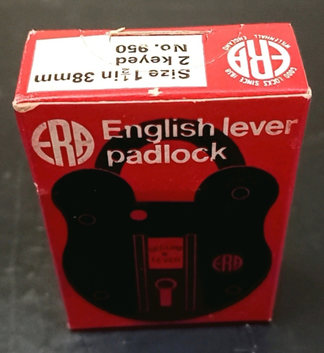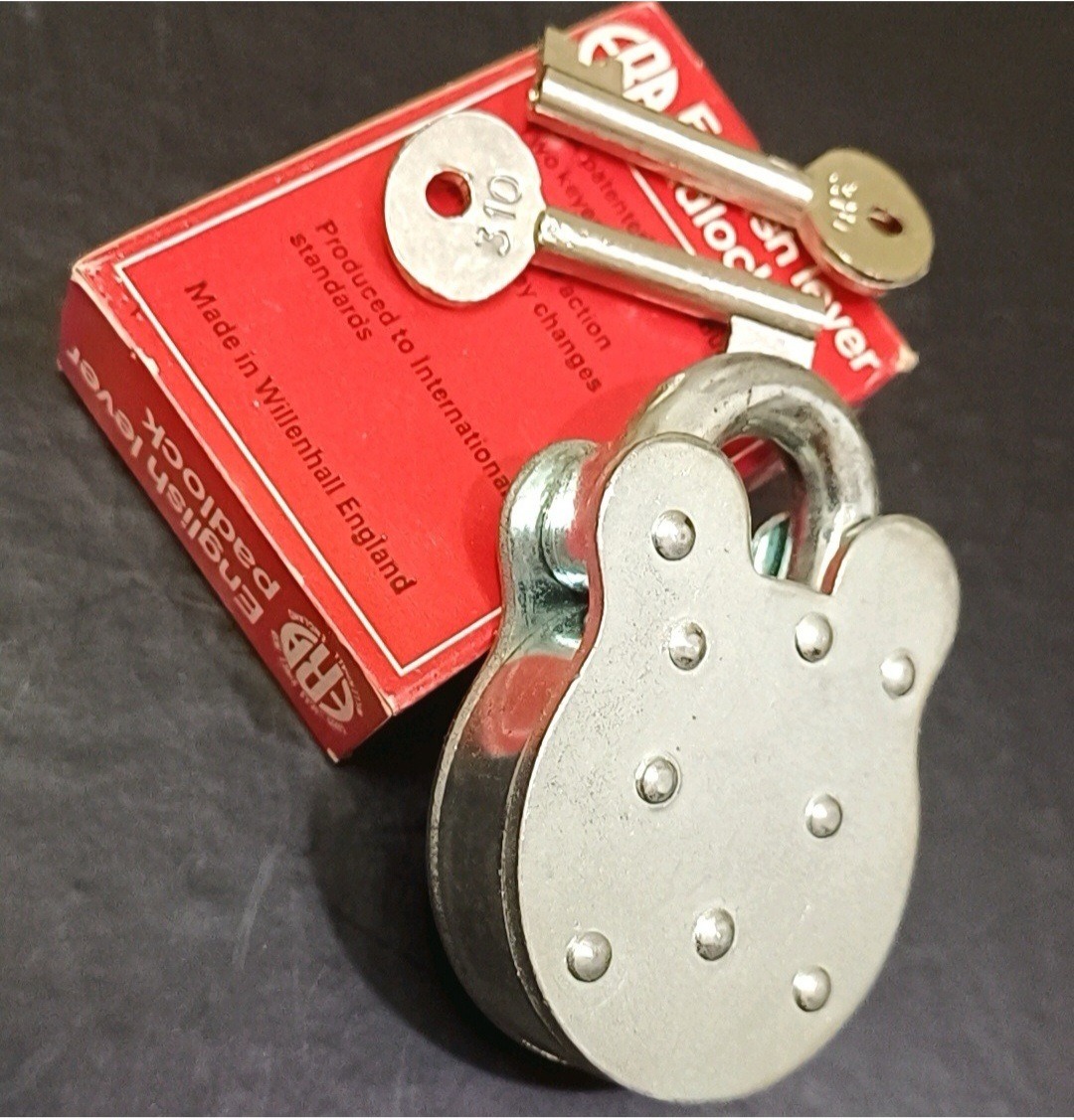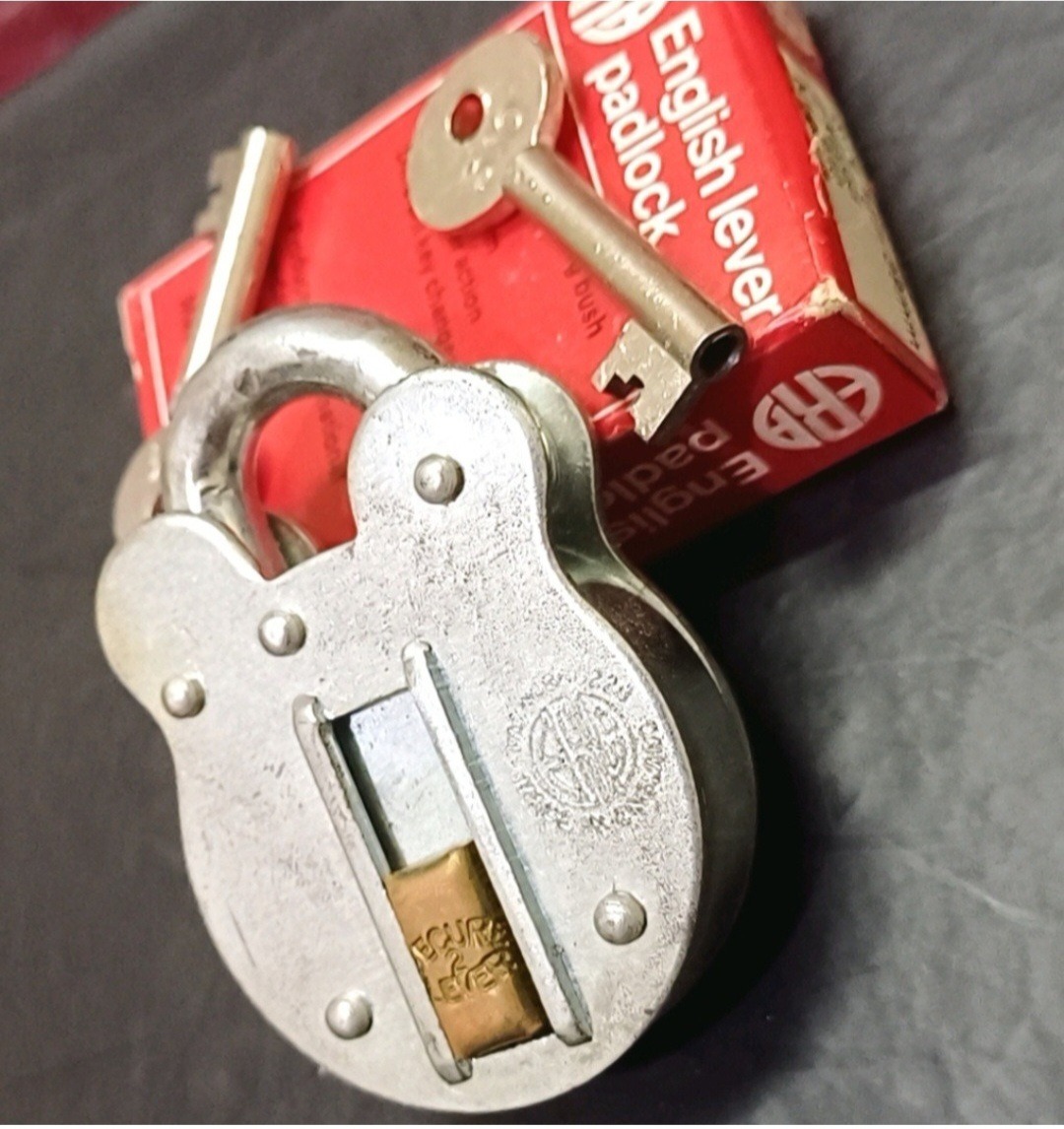 قفل اهرمی قدیمی انگلیسی،کاملا نو و آکبند،دارای جعبه فابریک و 2 عدد کلید،از برند معروف،فوالعاده زیبا،محکم و قوی،سنگین وزن،سایز کوچک(سایز کمیاب)،اندازه: 38 میلیمتر،قدمت حدود 60 سال.با این کیفیت بسیار بسیار کمیاب.توجه بفرمایید که از این نمونه قفل سالهاست که دیگه ساخته نمیشه و به این صورت نو و آکبند وجود نداره.مناسب برای کلکسیون