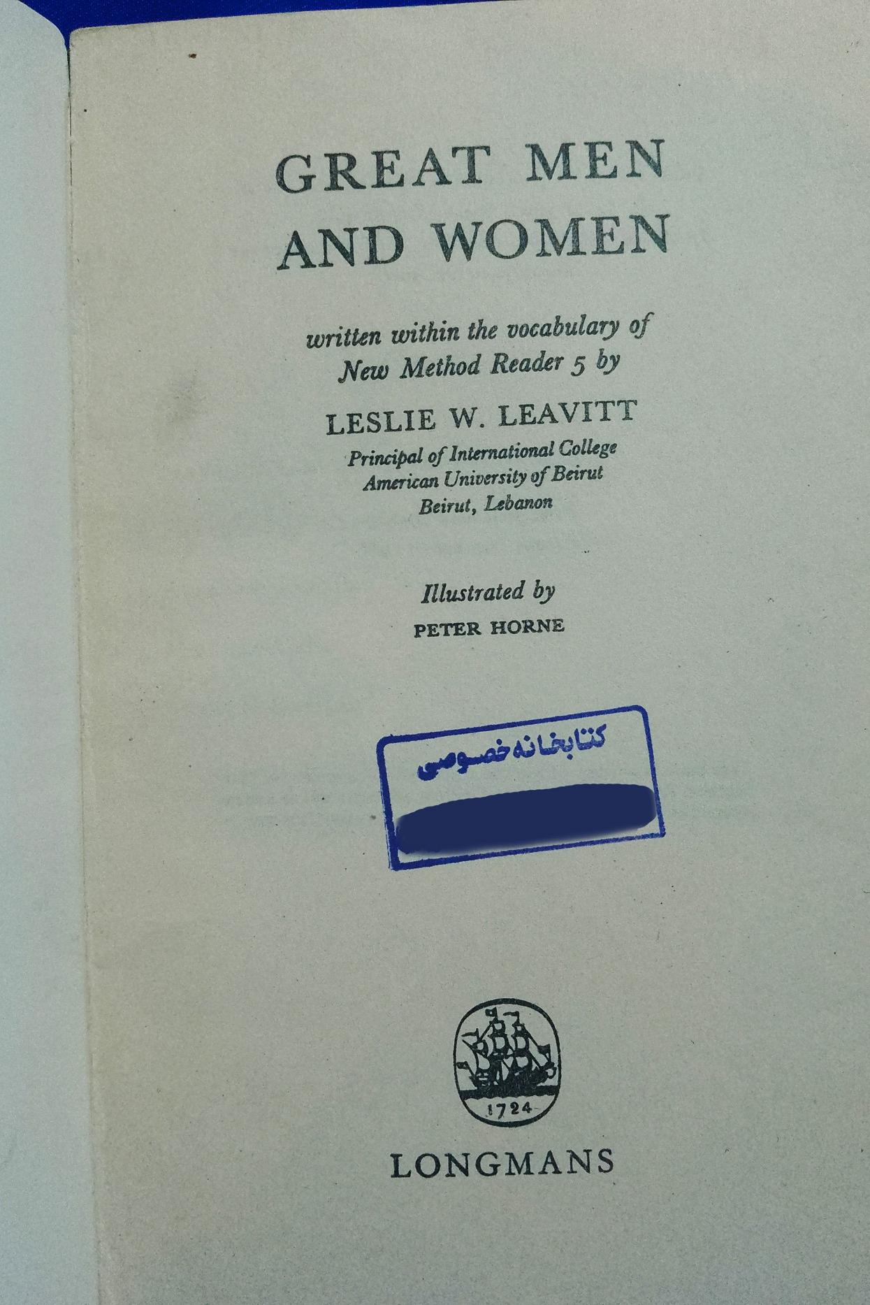 کتاب مردان و زنان بزرگ اثر لسلی لویت انتشارات لانگ منز چاپ 1965 ( سری کتابهای یادگیری زبان انگلیسی و Reader ) . کتاب دارای مهر کتابخانه خصوصی میباشد