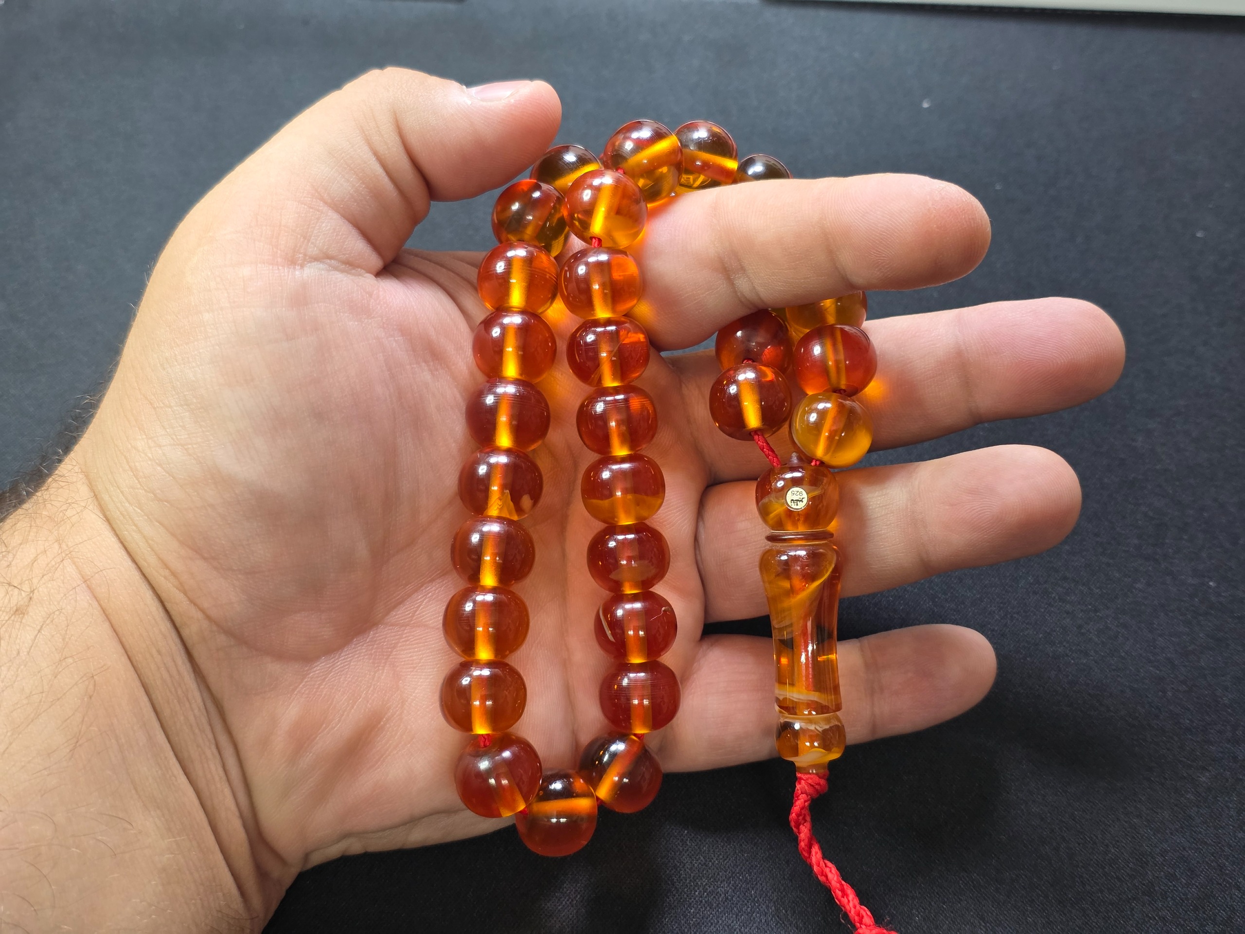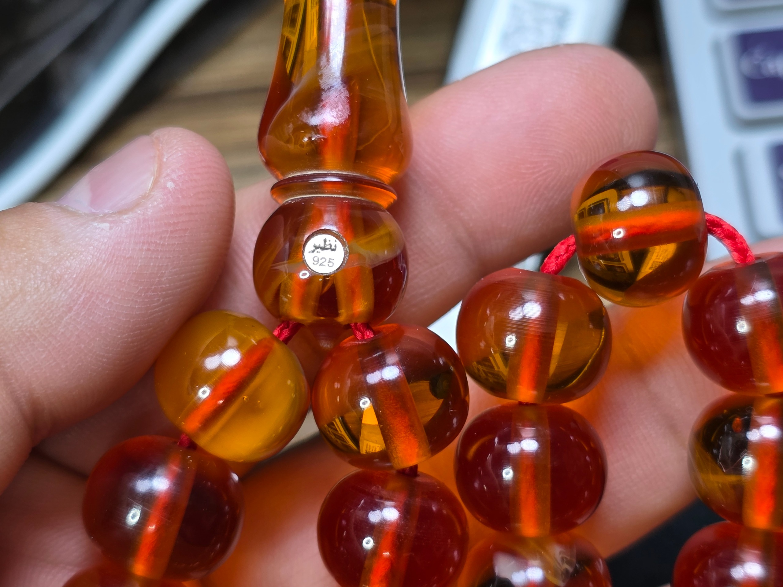 تسبیح کهربای رویال آب حیات زرافشان ناب لهستان درجه یک و کمیاب با مهر نقره کوب 925 سازنده استاد نظیر بسیار منحصر به فرد و کمیاب مهر نقره کوب 925 استاد نظیر که روی هر تسبیحی میاد فقط 3 الی 5 میلیون قیمت اون تسبیح رو بالا میبره