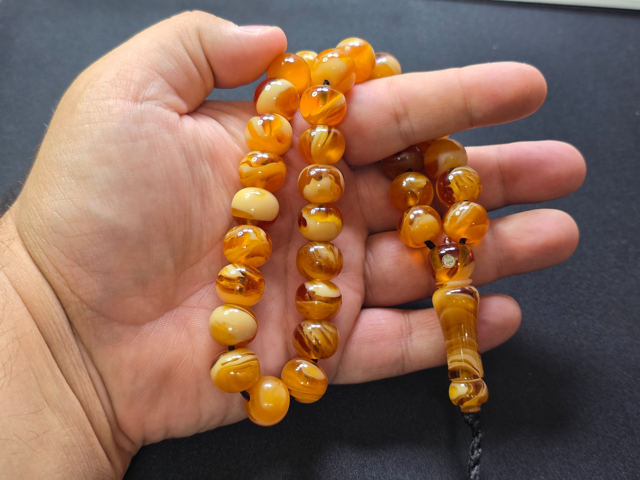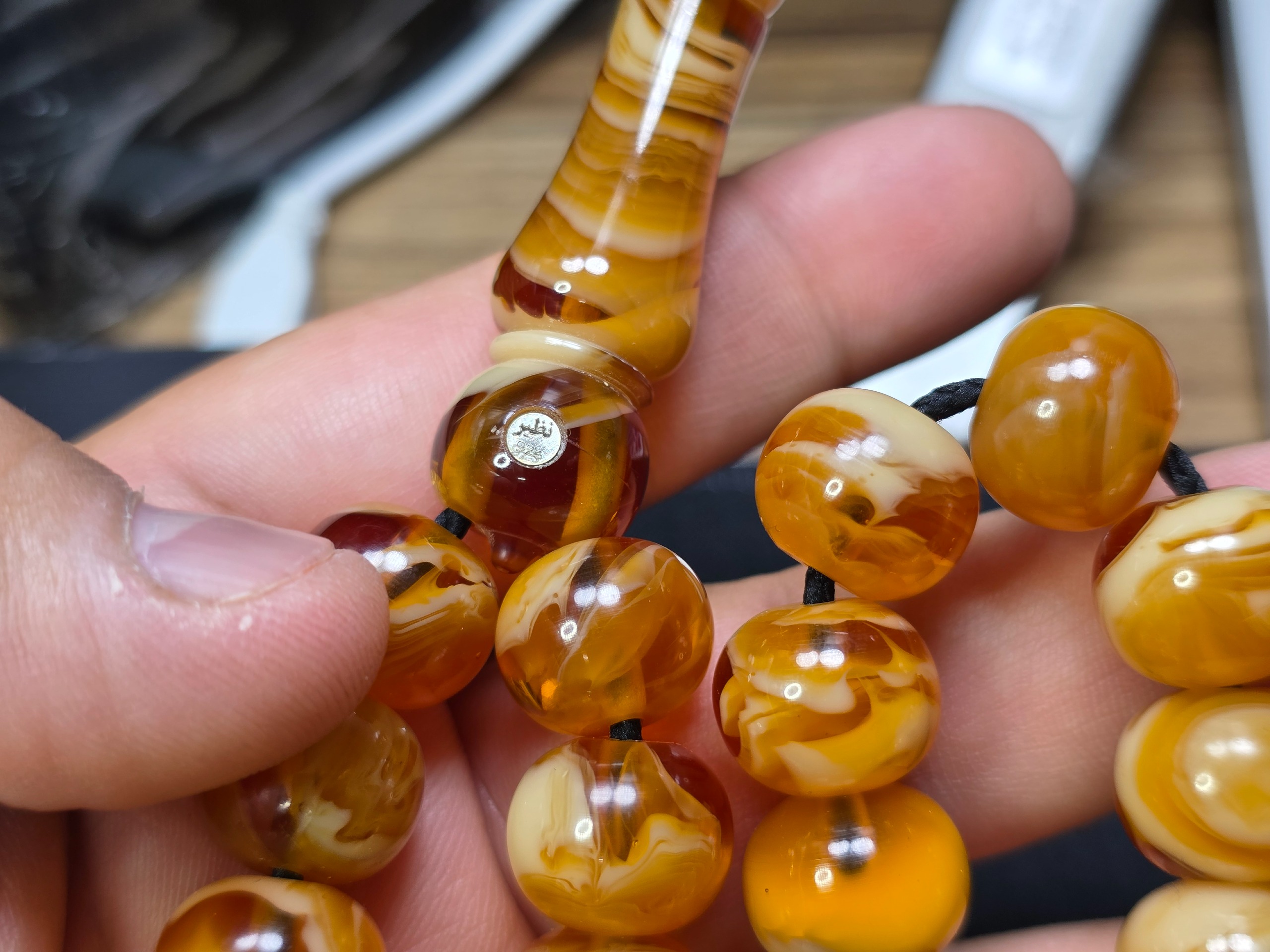 تسبیح کهربای رویال پر0می زرافشان ناب لهستان درجه یک و کمیاب با مهر نقره کوب 925 سازنده استاد نظیر بسیار منحصر به فرد و کمیاب مهر نقره کوب 925 استاد نظیر که روی هر تسبیحی میاد فقط 3 الی 5 میلیون قیمت اون تسبیح رو بالا میبره