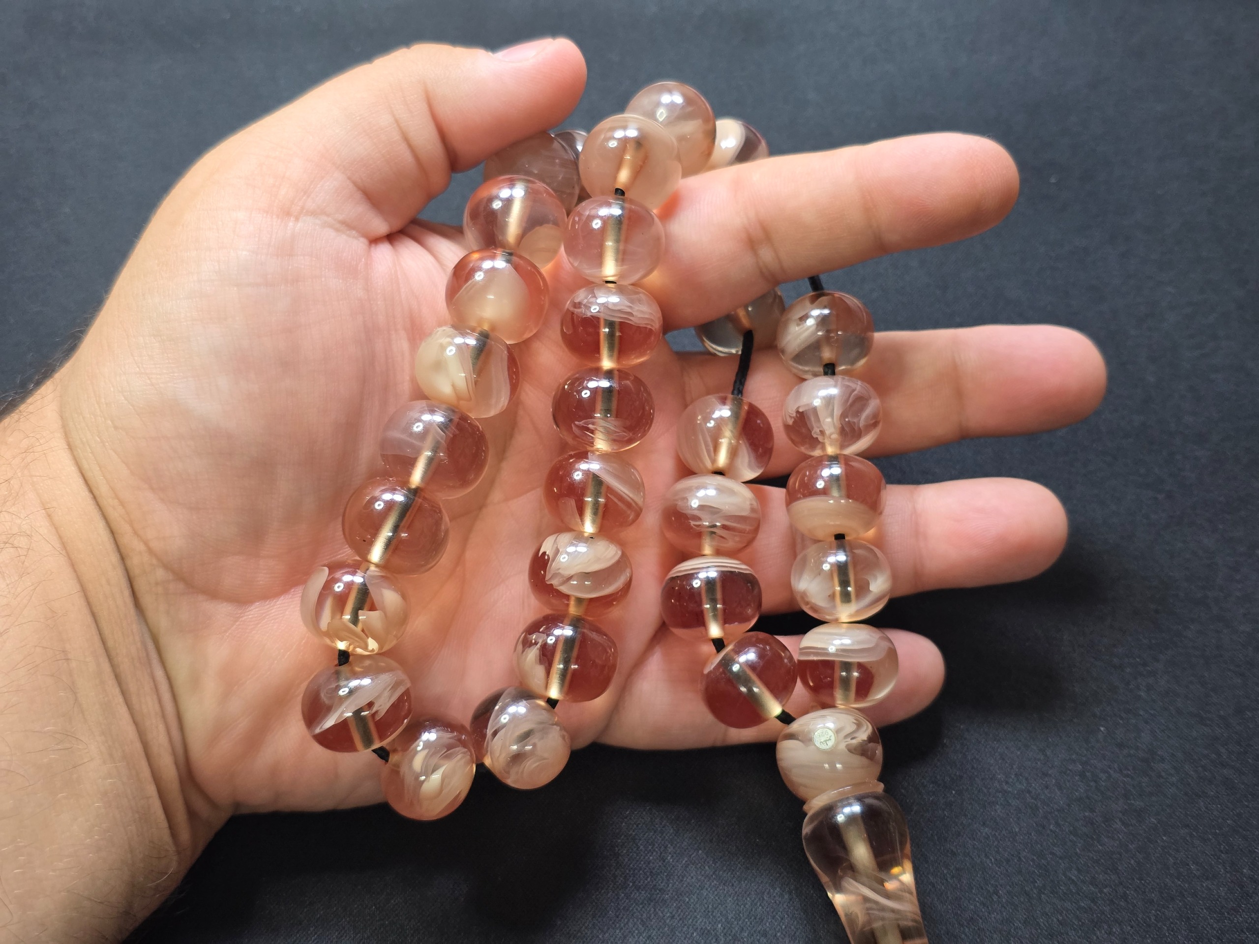 تسبیح دانه درشت و غولپیکر سایز 18کهربای پرچمی زرافشان ناب لهستان درجه یک با مهر نقره کوب 925 سازنده استاد نظیر بسیار منحصر به فرد و کمیاب مهر نقره کوب استاد نظیر که روی هر تسبیحی بیاد فقط 3 الی 5 میلیون قیمت اون تسبیح رو بالا میبره