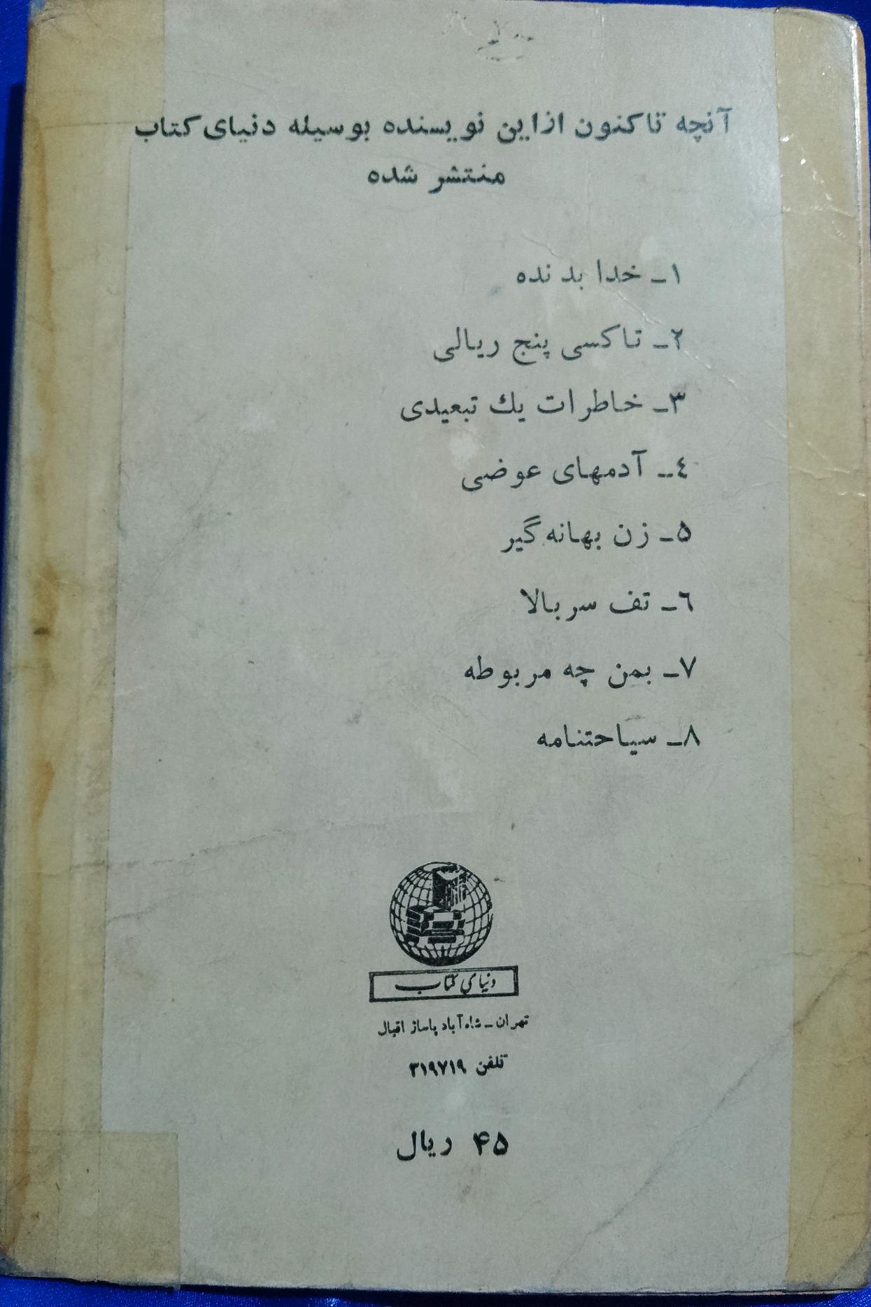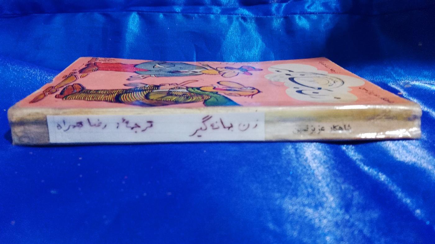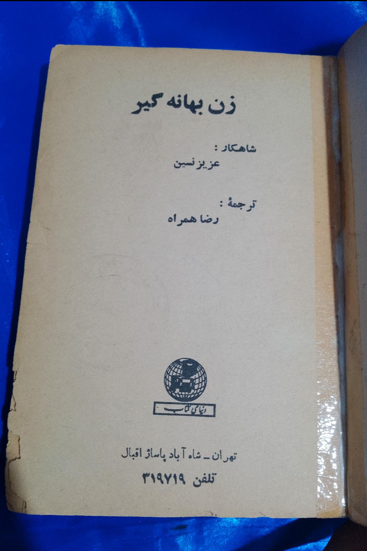 کتاب زن بهانه گیر اثر عزیز نسین چاپ قبل از انقلاب . همچون تصویر دور جلد رو و پشت و همچنین به همان صورت پشت آنها چسب خورده . پشت صفحه شناسنامه خط اهداکننده درج شده . کتاب دارای مهر کتابخانه میباشد . صفحات داخل در وضعیت عالی