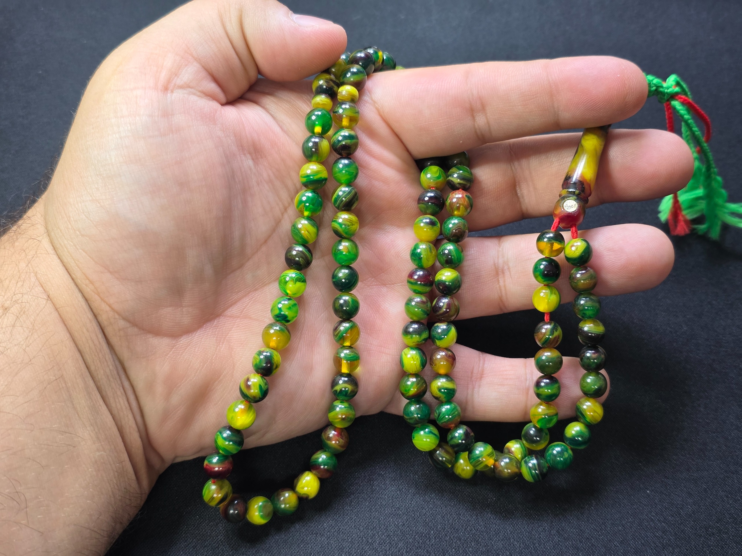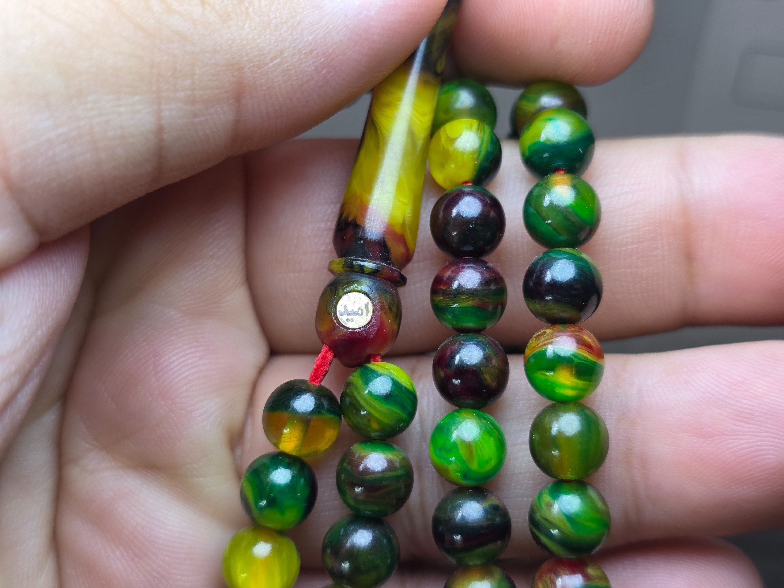 تسبیح بلند 101 دانه کهربای پرچمی زرافشان ناب لهستان درجه یک با مهر طلا کوب سازنده استاد (امید) بسیار منحصر به فرد و کمیاب مهر نقره کوب استاد نظیر که روی هر تسبیحی بیاد فقط 3 الی 5 میلیون قیمت اون تسبیح رو بالا میبره