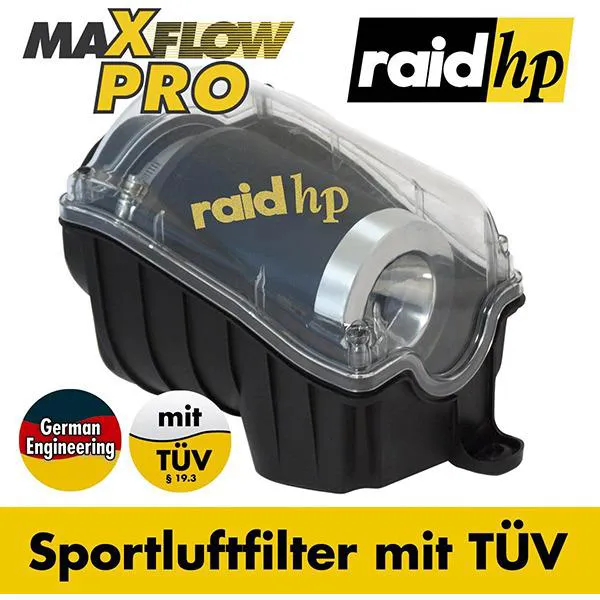 raid hp یک فیلتر هوای اسپرت را با Maxflow Pro ارائه میکند که میتواند با تمام سیستمهای اگزوز که دارای مجوز عملیات EC یا ABE هستند نصب و ثبت شود.
