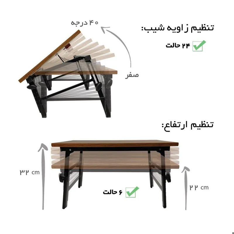 - قابلیت تنظیم ارتفاع و شیب میز مطابق با ارگونومی بدن ( رعایت صحیح وضعیت بدنی بر اساس فیزیک بدن)