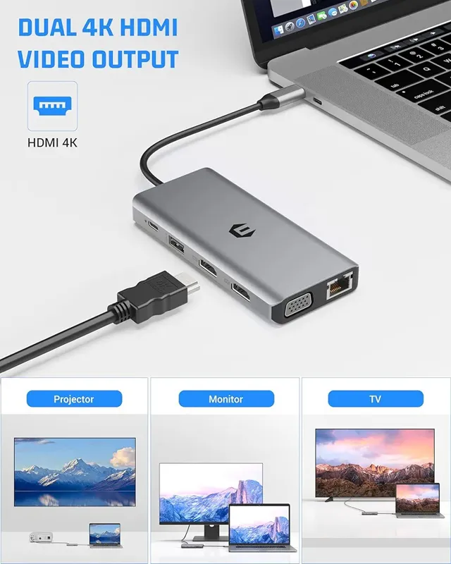 نمایش سهگانه فراگیر با 2 پورت HDMI و 1 پورت VGA، دید خود را گسترش دهید. از مدیریت همزمان چندین صفحه نمایش لذت ببرید. چه برای کار باشد و چه برای سرگرمی، هاب ما تجربه بصری شما را به سطح کاملاً جدیدی میرساند.
