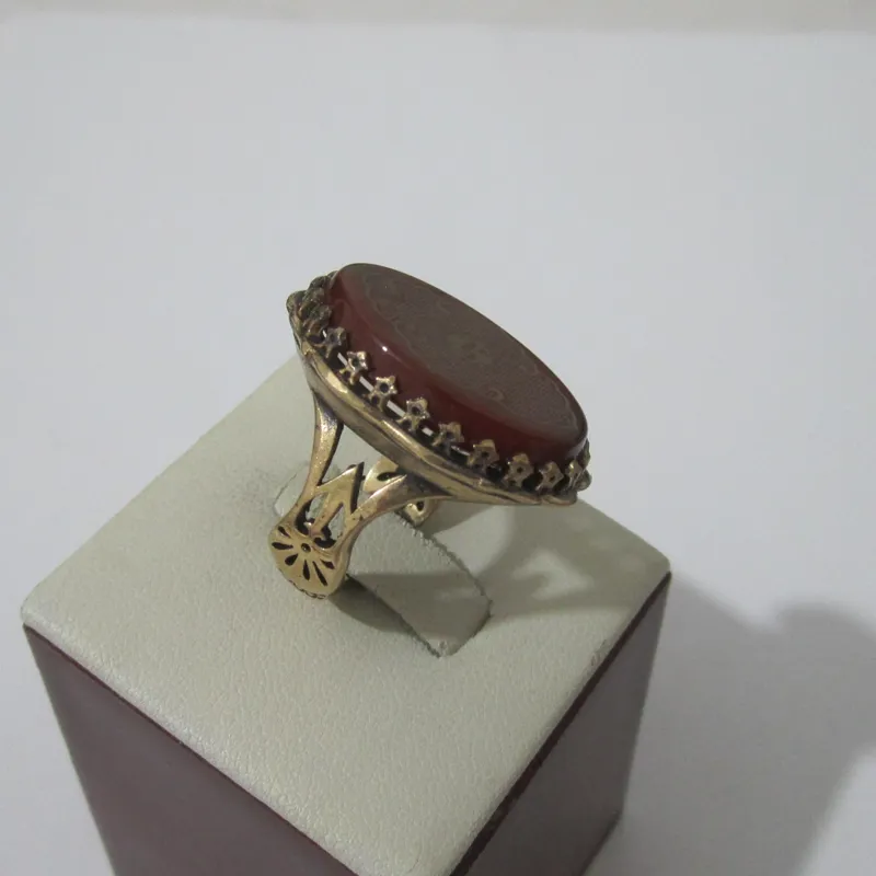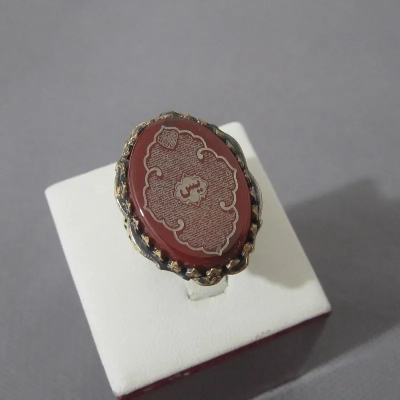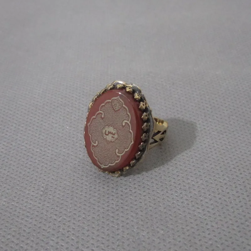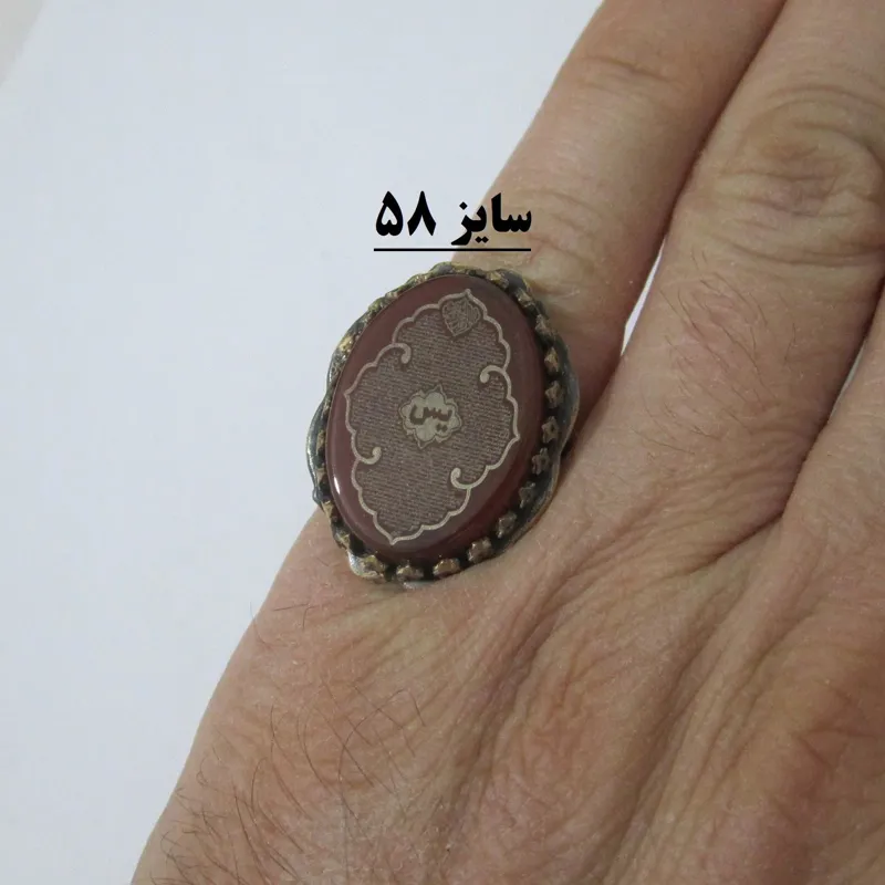 انگشتر مردانه با رکاب طلا روسی و کتیبه عقیق سرخ اصل دارای سوره مبارکه یاسین بر روی سنگ طبق تصویر (1568). ابعاد سنگ 1.8 در 2.5 سانتیمتر است؛ مطابق با اندازه های حلقه سایز استاندارد، سایز این انگشتر 58 است (قطر داخل انگشتر 18.5 میلیمتر است). رکاب این انگشتر، آلیاژی از مس و روی است که با نام طلا روسی شناخته می شود. توجه فرمایید دقیقا همین محصول که در تصویر می بینید برای مشتری ارسال خواهد شد. خواهش می کنم برای اطلاع از زمان دقیق دریافت بسته با اداره پست منطقه ای تماس بگیرید.