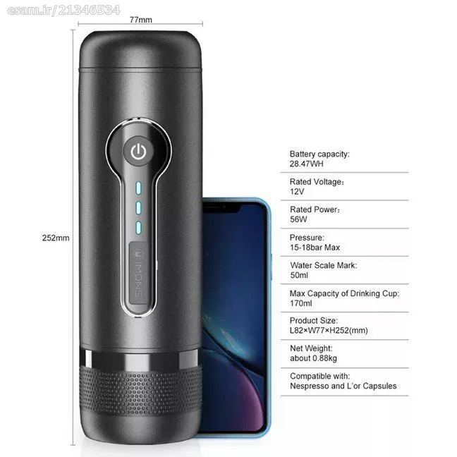 حمل که آب را می جوشاند و با باتری قابل شارژ لیتیوم 3x2600 میلی ساعت کار می کند و با دمای 90 درجه سانتیگراد گرم می شود. به طور خودکار قهوه را در فنجان نوشیدنی چکه می کند. برای طراحی جمع و جور و سبک در فضای باز، آن را در کیف خود قرار دهید می توانید از کابل خودرو