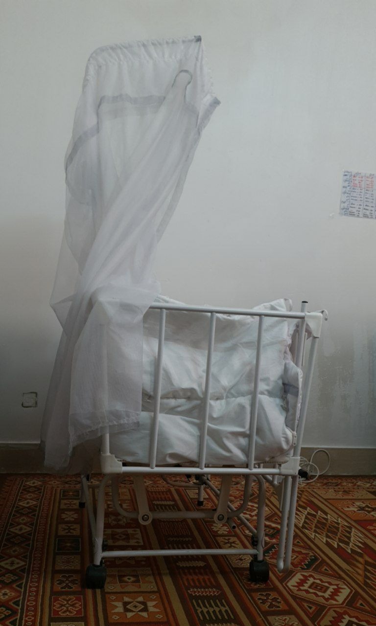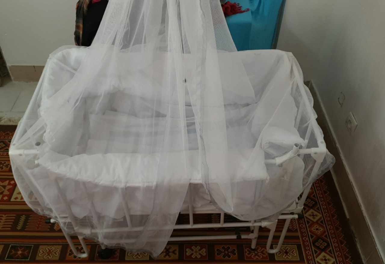 تخت فلزی حفاظ دار نوزاد کاملا  با روتختی تشک و پرده پشه گیر