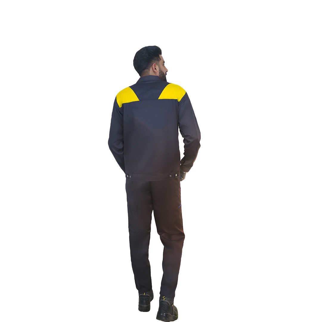لباس کار تیتان سرمهای زرد کد i25: لباس کاری مقاوم و جذاب با طراحی دو رنگ از ایمن صنعت ایران.
