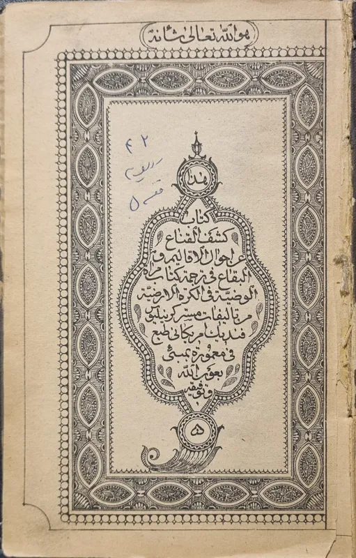کشف القناع عن احوال الاقالیم و البقاع تالیف کرنیلیسوس فندیک آمریکایی ترجمه فخرالدین قاسم گلپایگانی سنه 1271 ه ق بمبئی
