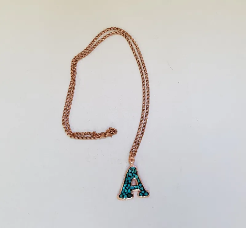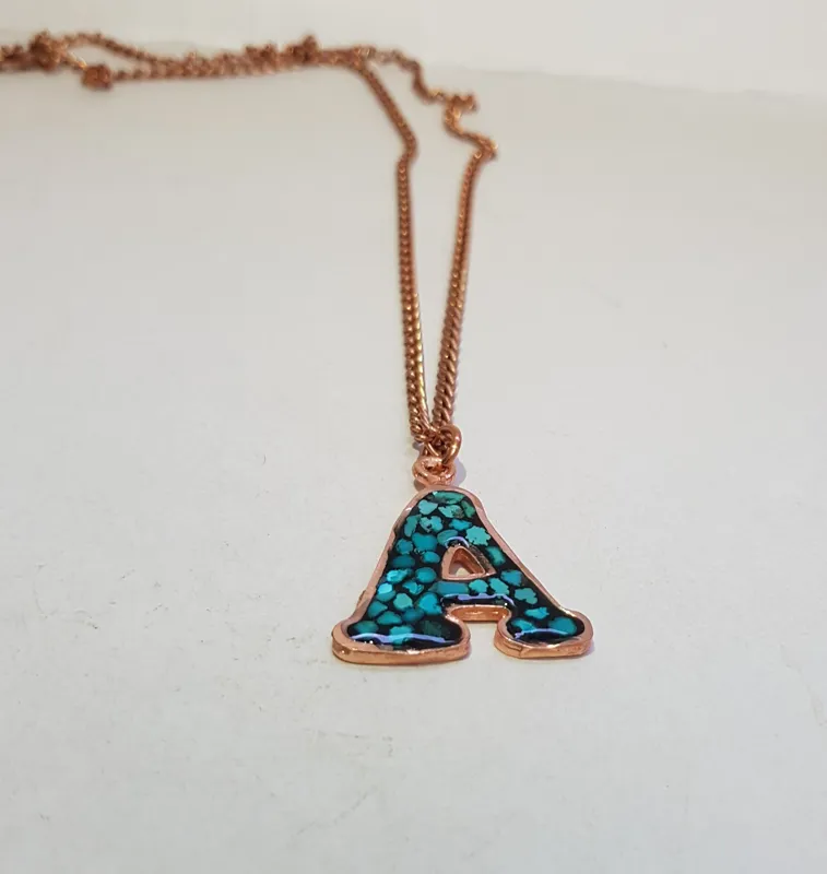 یک گردنبند مسی فیروزه کوبی شده طرح اسم A برای خوش سلیقه ها، دارای خواص درمانی مس،خواص فیروزه دفع چشم و نظر جذب انرژی مثبت،محصول فوق دارای زنجیر مسی شصت سانتی میباشد.