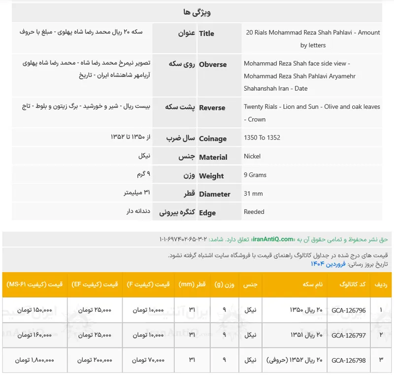 سکه بانکی 20 ریال مبلغ با حروف پهلوی 1352